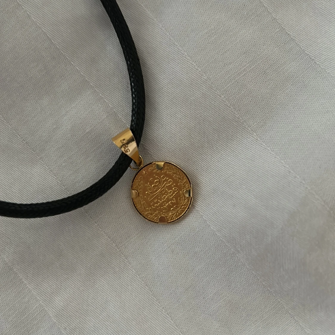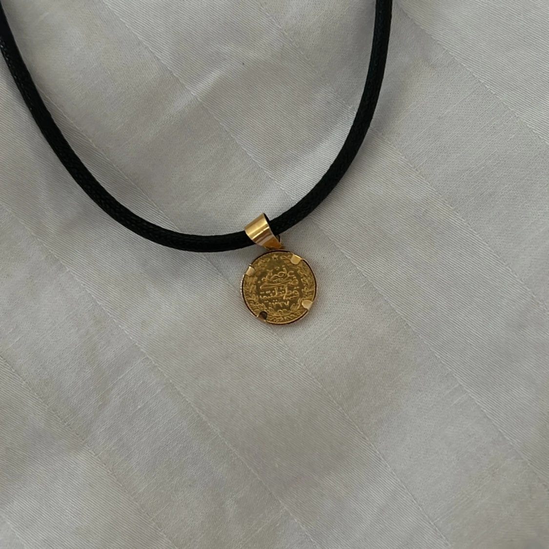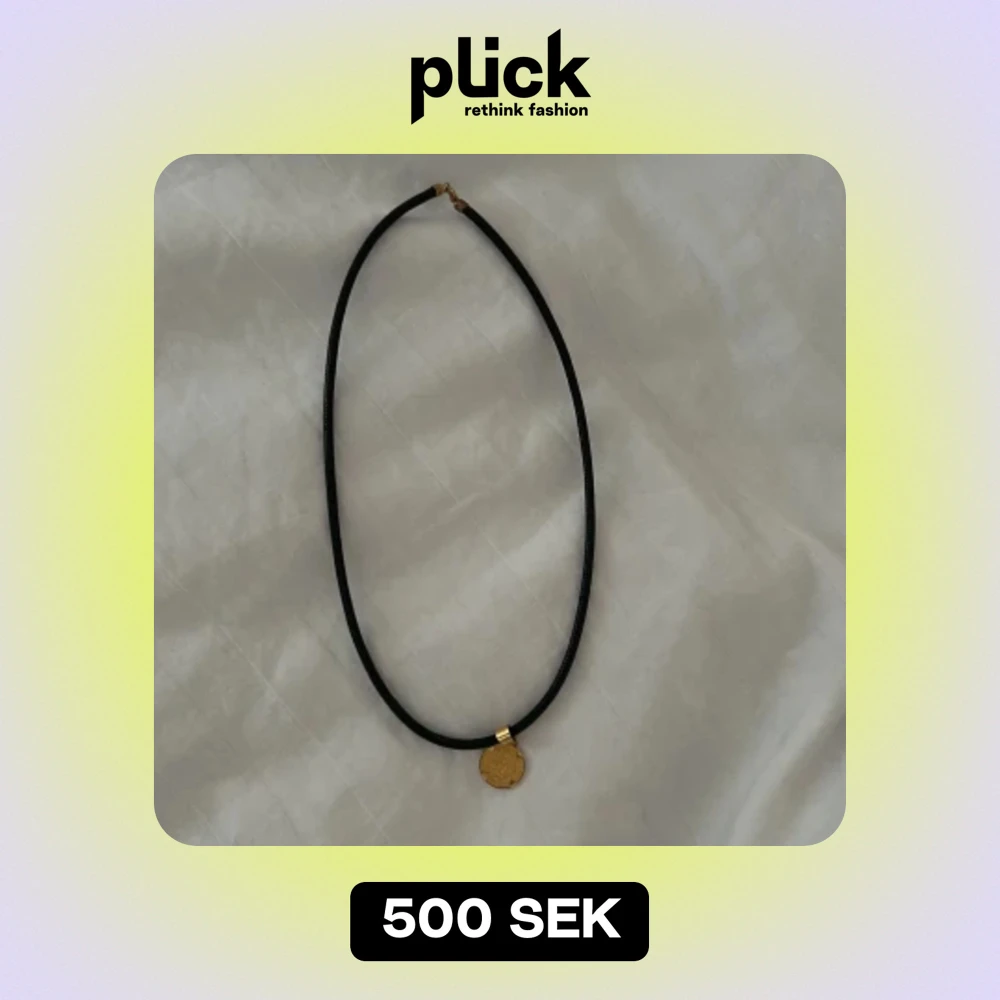 Lira halsband i guld med svart kedja. 585 stämpel, 14k guld.