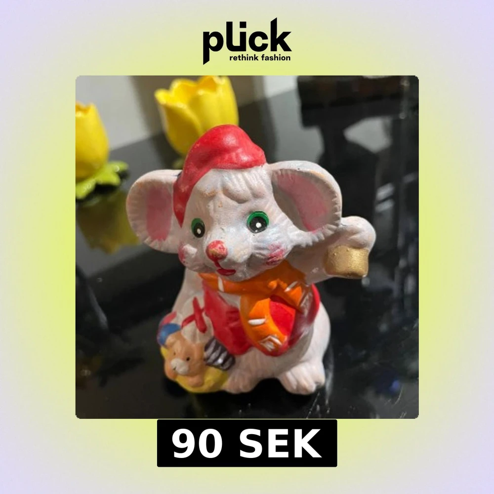 Charmig liten musfigur elegant i keramik, ca 10 cm hög. Musen har grönskimrande ögon, röd mössa och röd väst, samt en orange halsduk med vita detaljer. Den håller en guldfärgad klocka och har en nalle bredvid sig. Perfekt som dekoration eller present.
