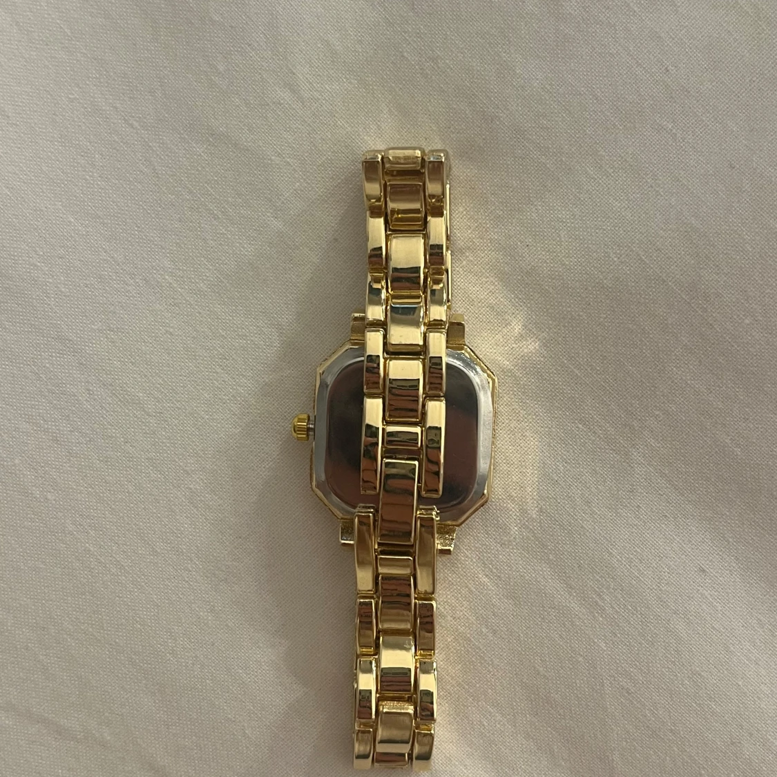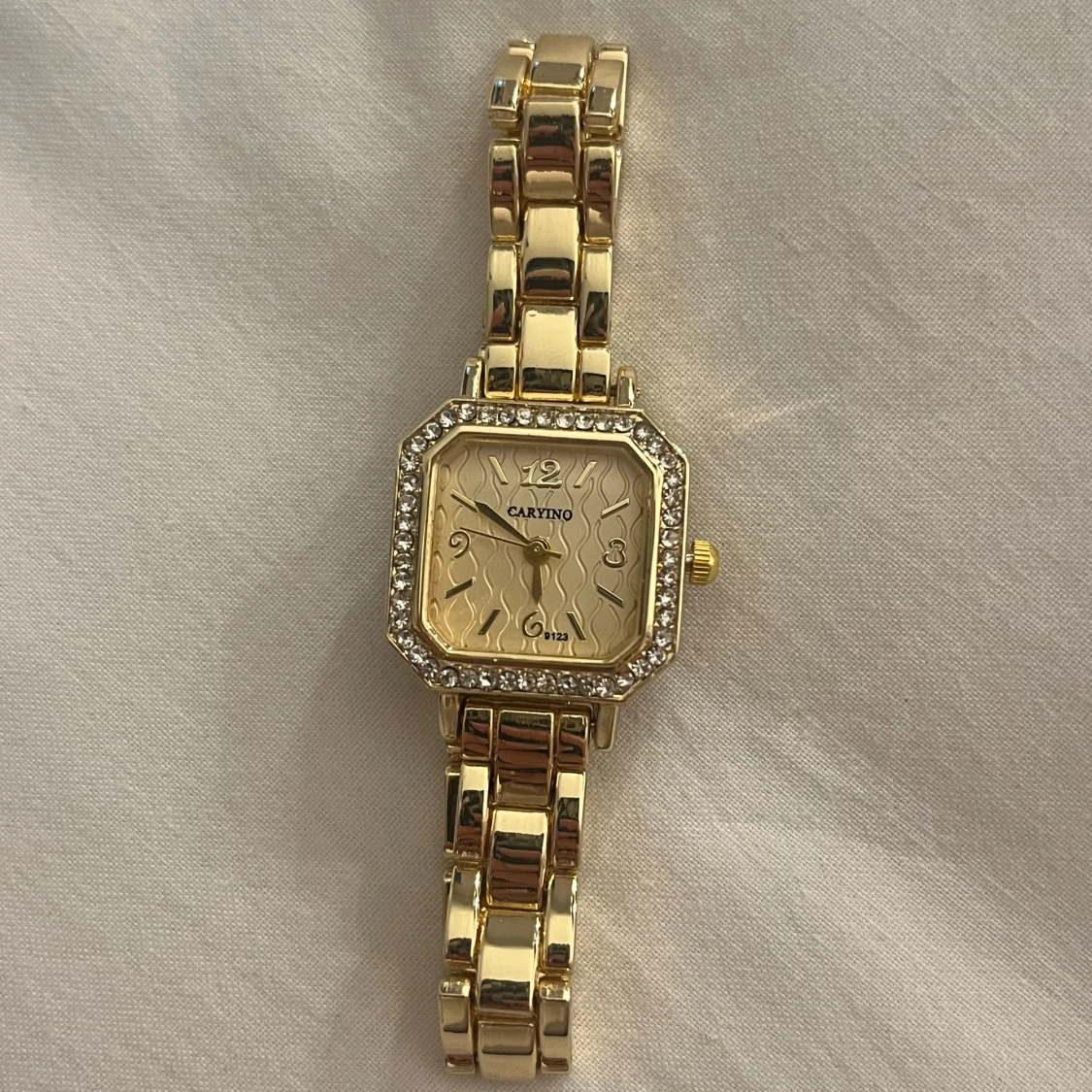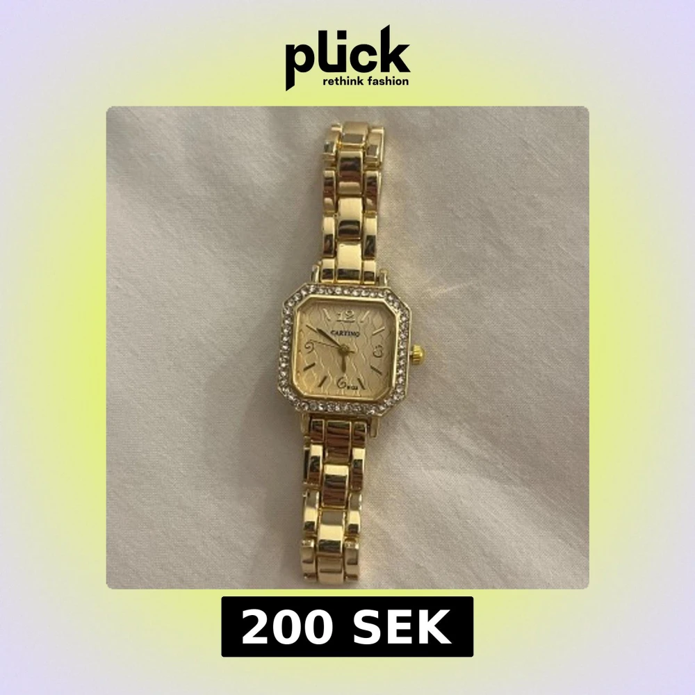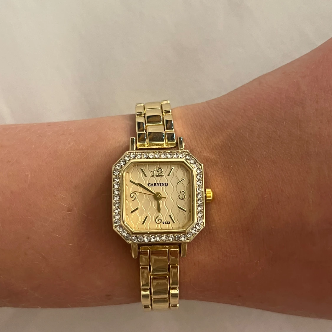 Snygg guldig klocka med fyrkantig urtavla, glittrande stenar runt boetten och vågigt mönster på urtavlan. Eftersom jag inte använder guld så har denna aldrig kommit till användning därför den är i helt nytt skick