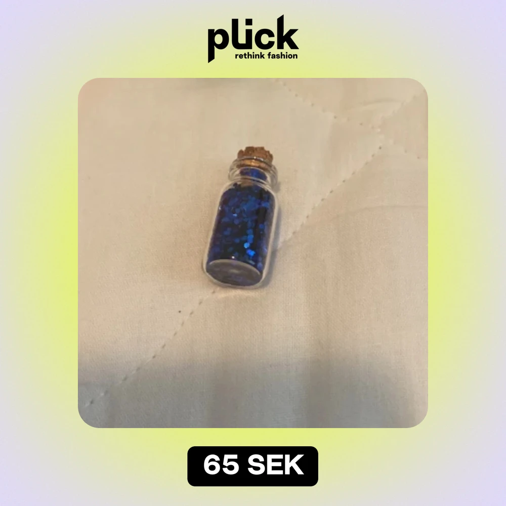 En liten glasflaska fylld med blått glitter och försluten med en kork. Flaskan kan användas som dekoration eller för att skapa smycken.