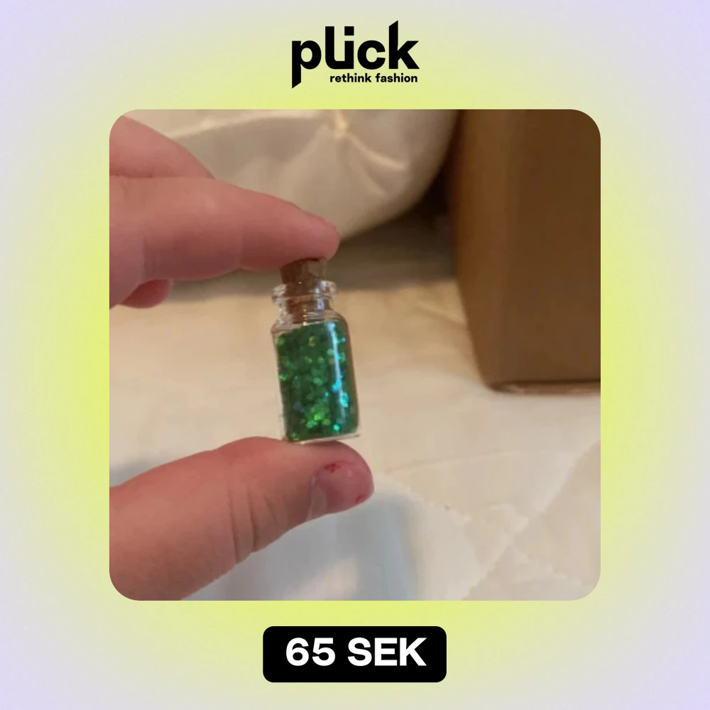 En liten glasflaska fylld med grönt glitter och försluten med en kork. Perfekt för dekoration eller hantverk.