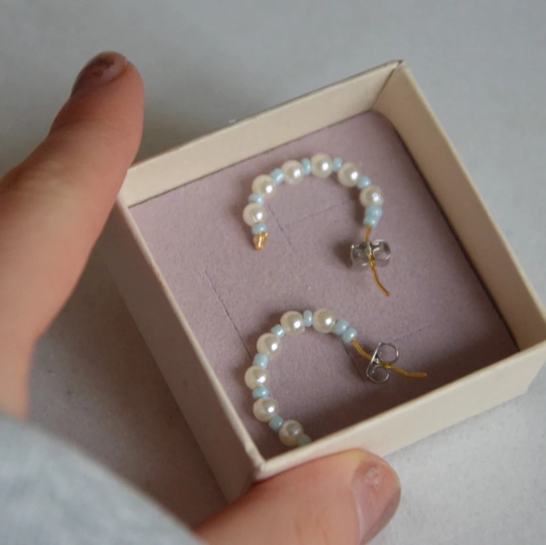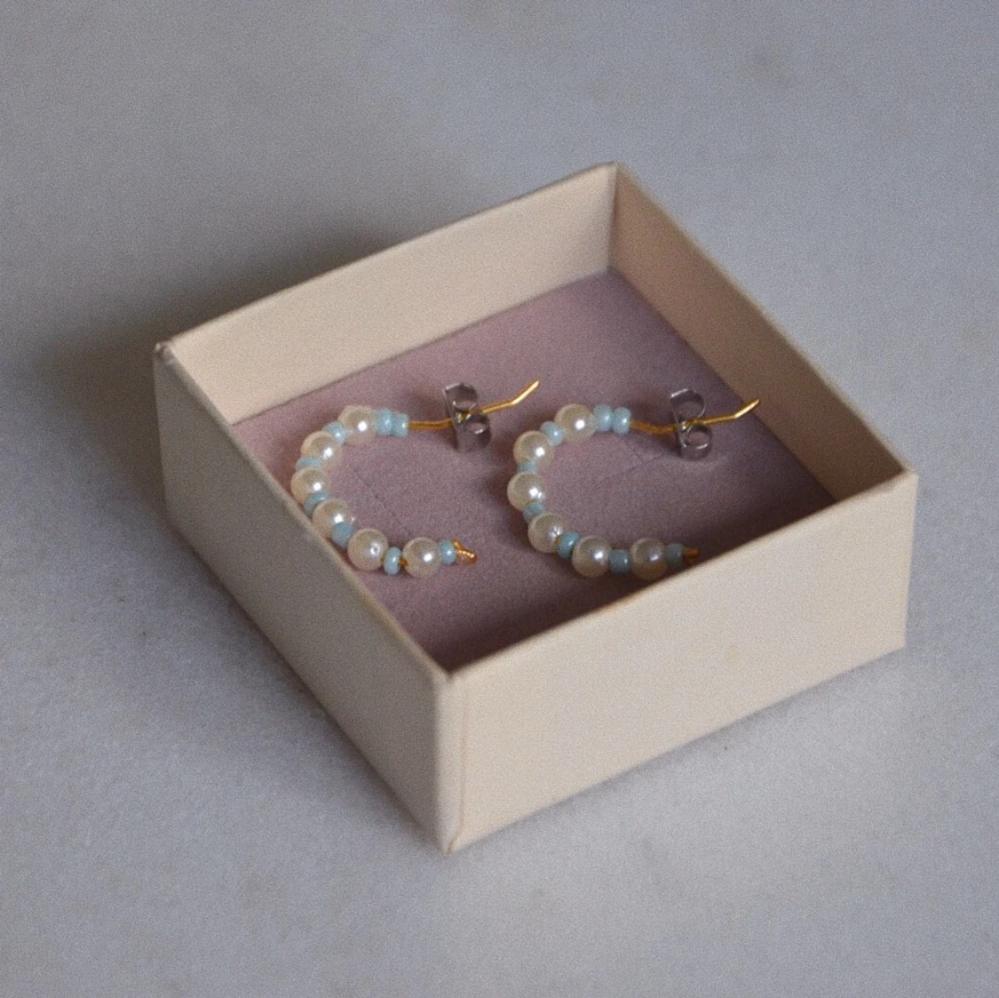 Örhängen med ljusblå och vita pärlor designade av vunodesign-Vera unosson❤️ fria från nickel.