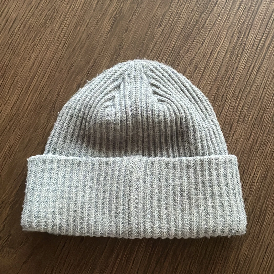 Snygg ljusgrå ribbstickad mössa med uppvikt kant och diskret tygpatch framtill med märket L'ÉTERNITÉ. Perfekt för kyliga dagar och enkel att matcha med olika outfits.
