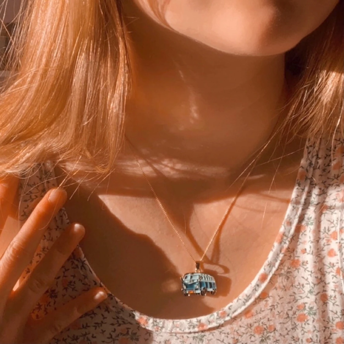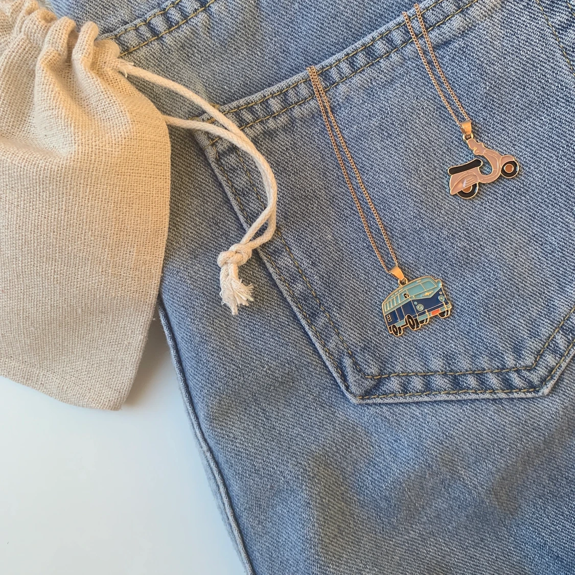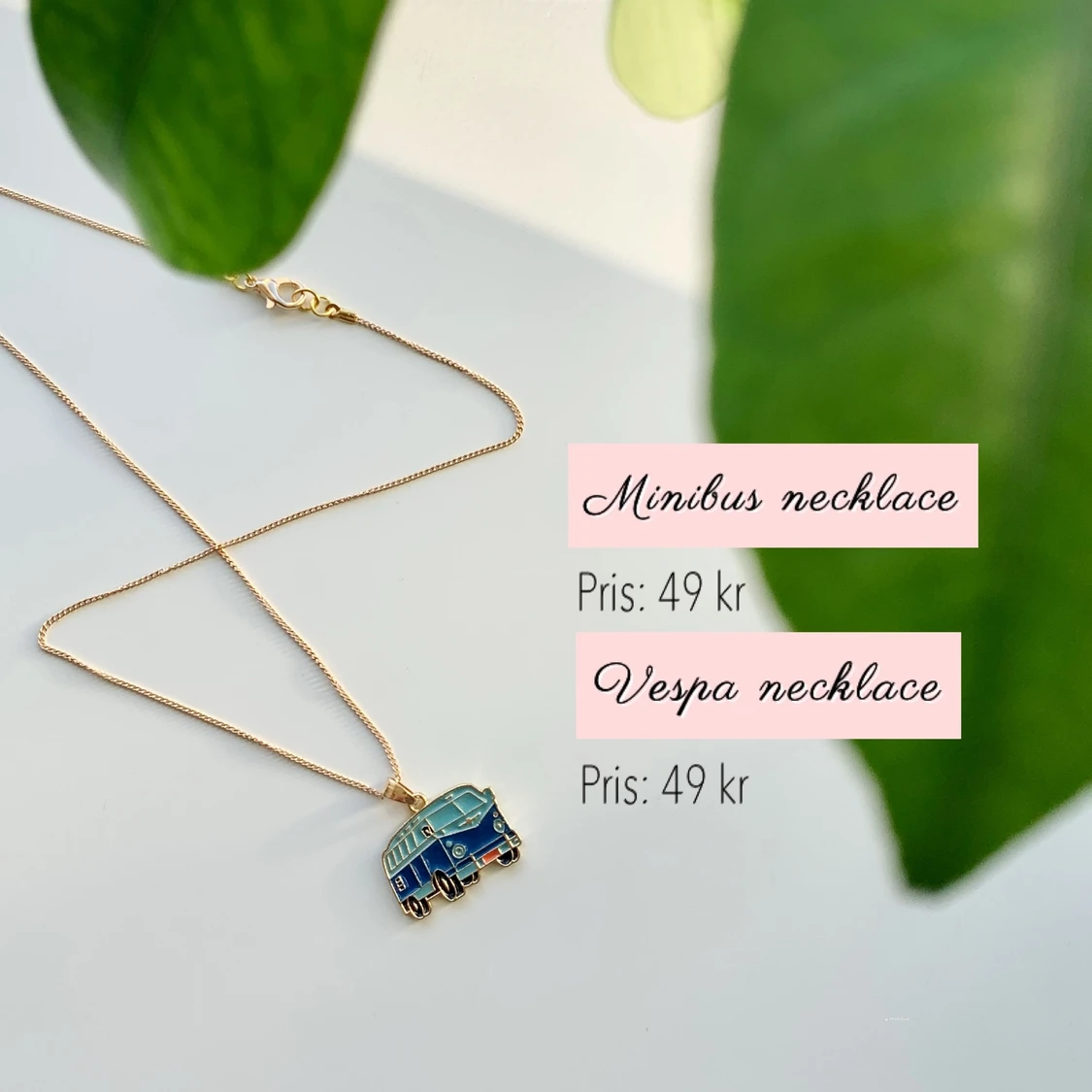 Road trip vibe☀️🌵 Halsband med minibuss och vespa/moped. Kedjan är väldigt tunn men stark, behaglig att ha på sig. Den har guldplätering och är nickelsäker💗 Styckpris