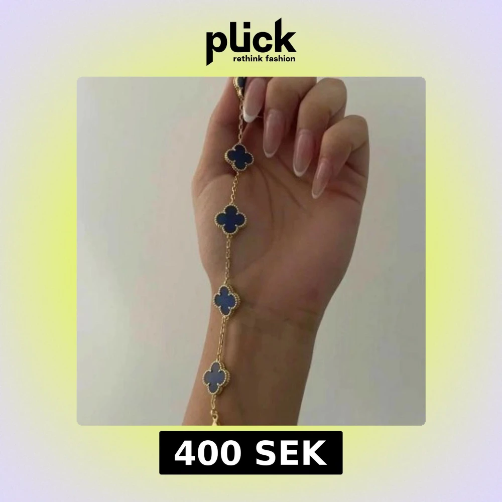 Snyggt armband med blåa fyrklöverformade hängen infattade i guldfärgad metall. Rostfritt stål!