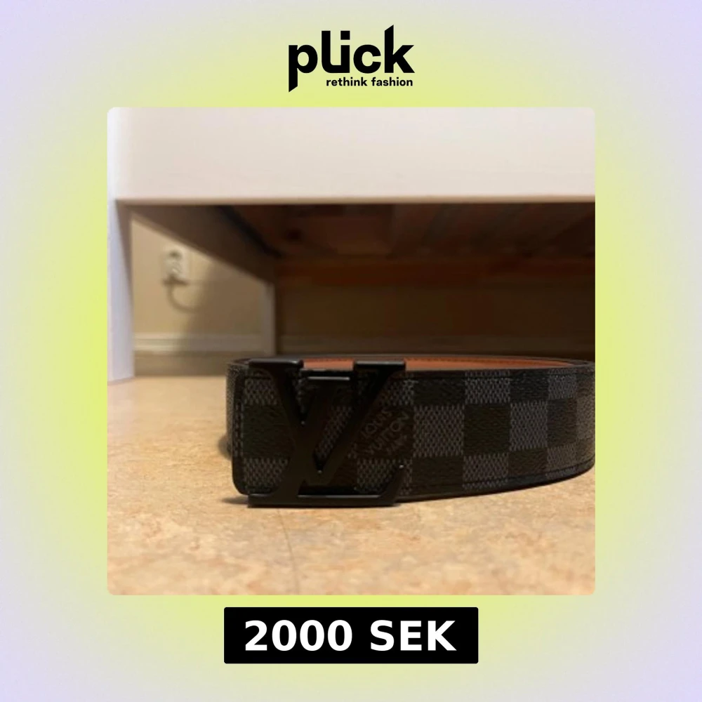 Säljer ett stilrent Louis Vuitton bälte i svart skinn med klassiskt rutigt mönster och en stor LV-logga i metall som spänne. Bältet har en snygg och modern look som passar perfekt till jeans eller kostymbyxor. Insidan är brun och bältet har flera hål för justering.
