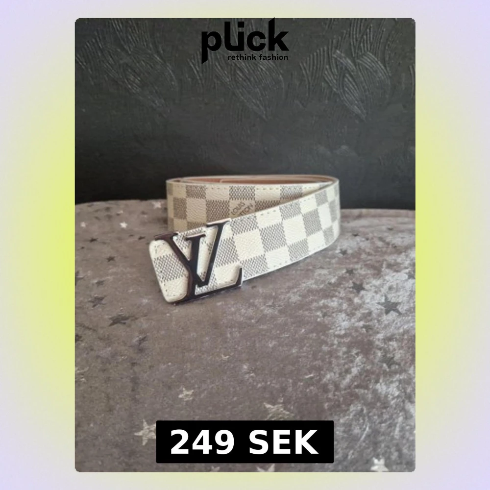Säljer ett snyggt bälte från Louis Vuitton med klassiskt rutigt mönster i beige och grå toner. Bältet har en stor metallspänne med LV-logga framtill. Perfekt accessoar för att lyfta din outfit.