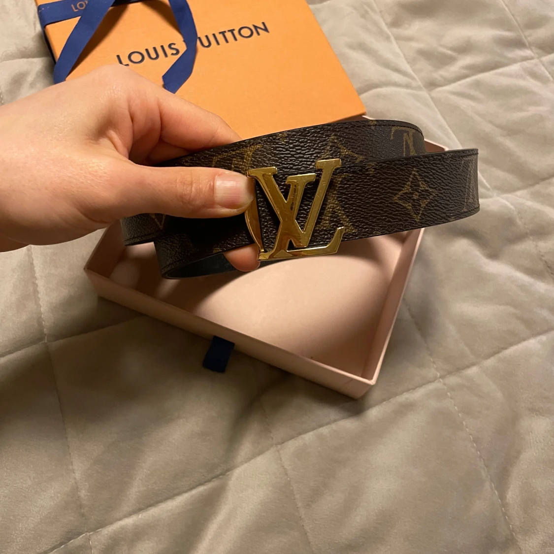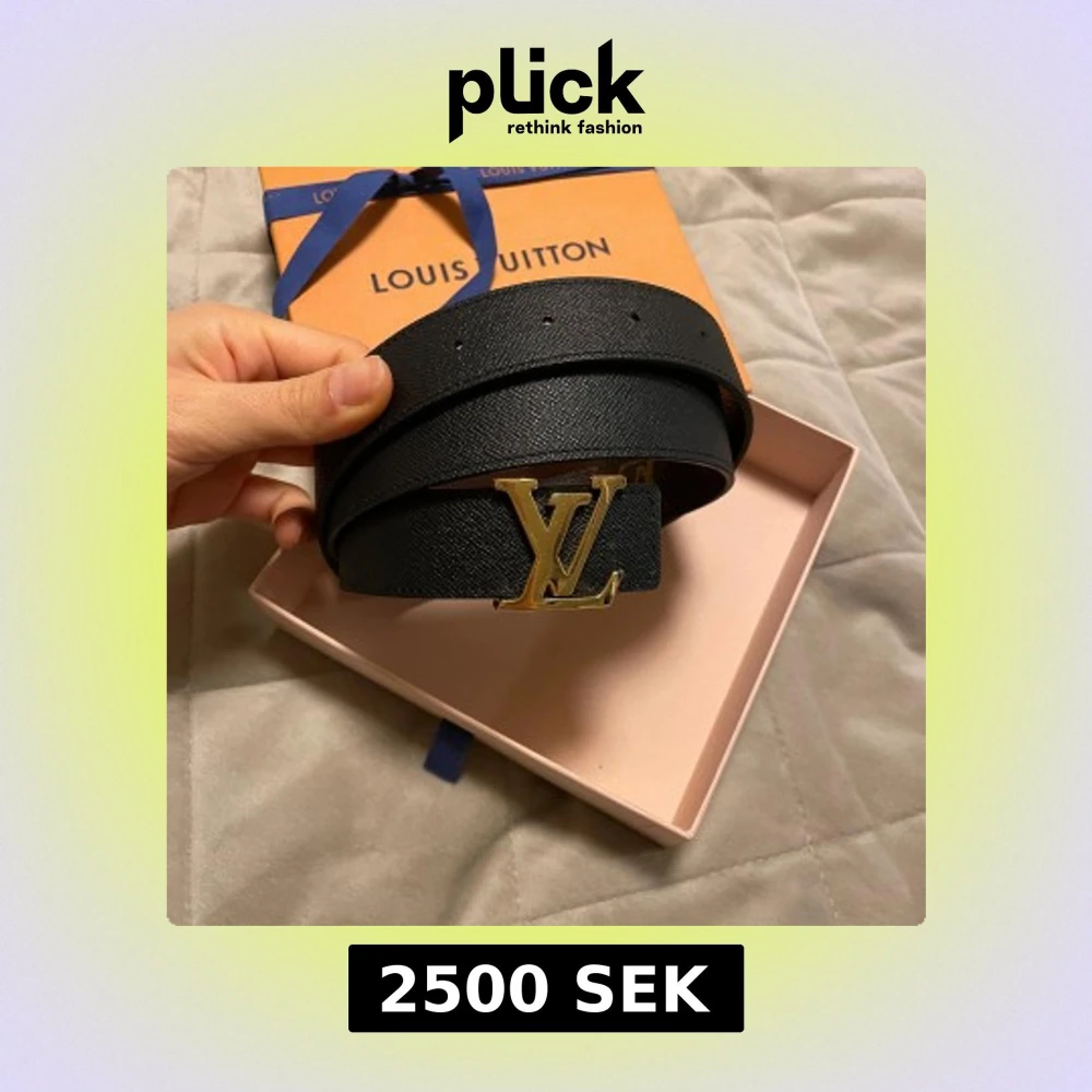 Snyggt bälte från Louis Vuitton med en ikonisk LV-spänne i guld. Ena sidan är svart och den andra har det klassiska bruna monogrammönstret. Perfekt för att ge din outfit en lyxig touch.