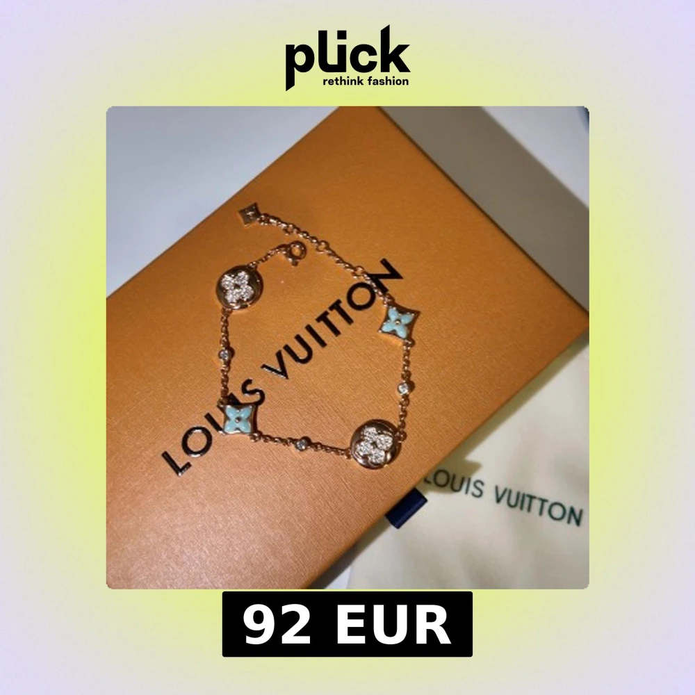Lyxigt armband från Louis Vuitton i roséguld med ikoniska LV-blommor och stjärnor. Dekorerat med ljusblå emalj och gnistrande stenar, samt LV-logga på baksidan av berlockerna. Kedjan är tunn och elegant, perfekt för att lyfta din outfit.