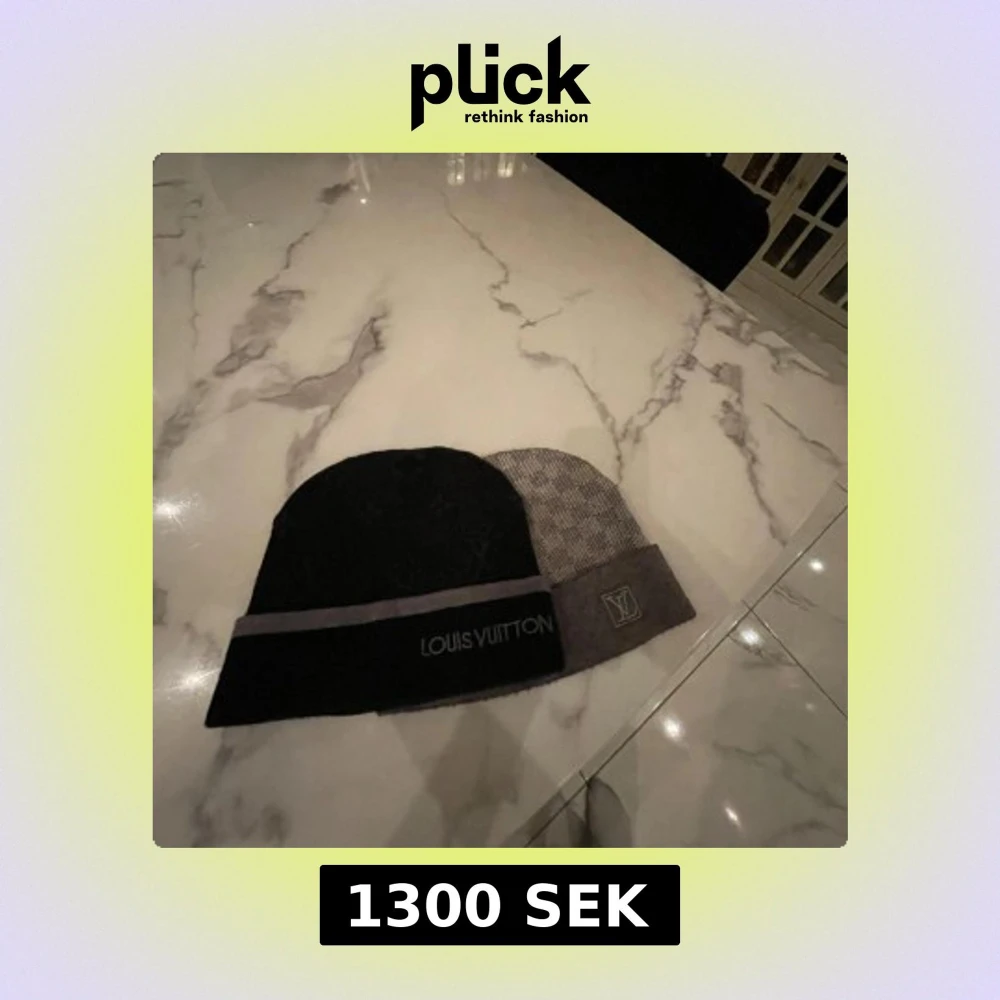 Säljer två stilrena mössor från Louis Vuitton. Den ena är svart med grå rand och broderad logotyp, den andra är grå med ett diskret mönster och logotyp. Perfekta för att hålla värmen med stil.