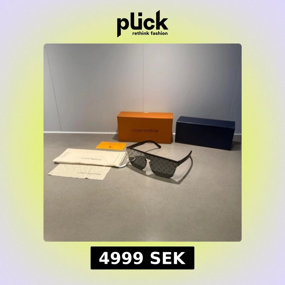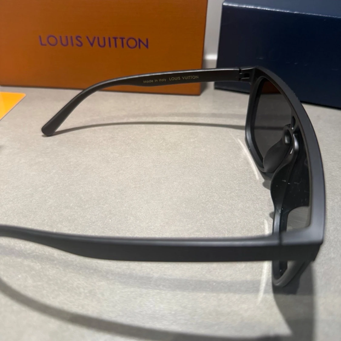 Stilrena svarta solglasögon från Louis Vuitton med LV-monogram på glasen. Bågarna är i svart plast och har en modern, kantig form. Perfekt accessoar för dig som vill sticka ut med exklusiv design.