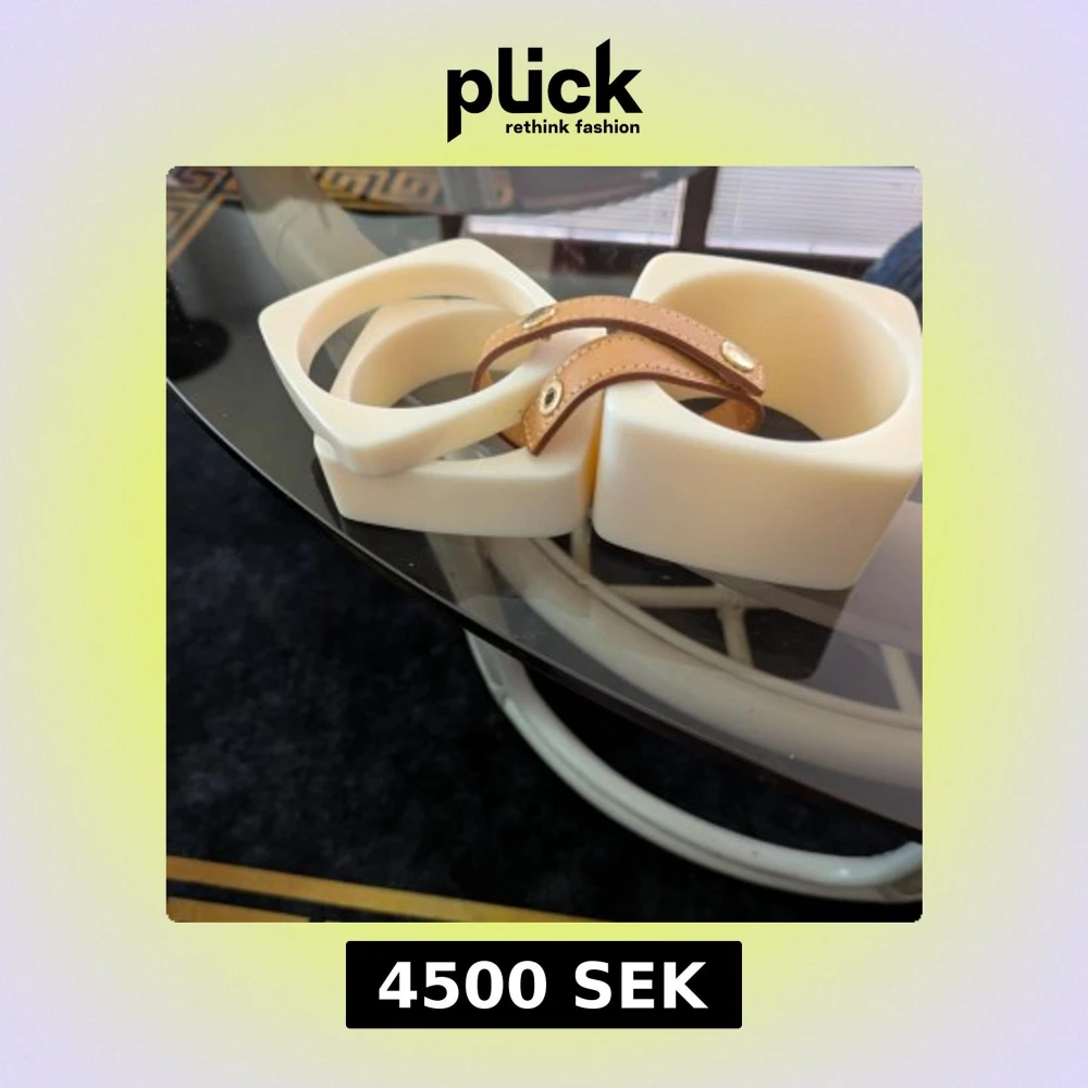 Unika chunky armband från Louis Vuitton i vit plast med fyrkantig form och detaljer i ljust brunt läder med guldiga nitar. Perfekt statement piece för dig som vill sticka ut med lyxig och cool accessoar.
