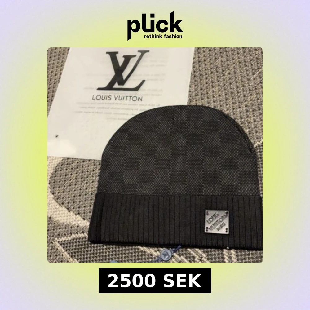 Snygg svart mössa från Louis Vuitton med diskret rutigt mönster och ribbad uppvikt kant. Märkesplakett i metall framtill och klassisk LV-tag på insidan. Perfekt för dig som vill ha en lyxig och stilren accessoar till vintern.