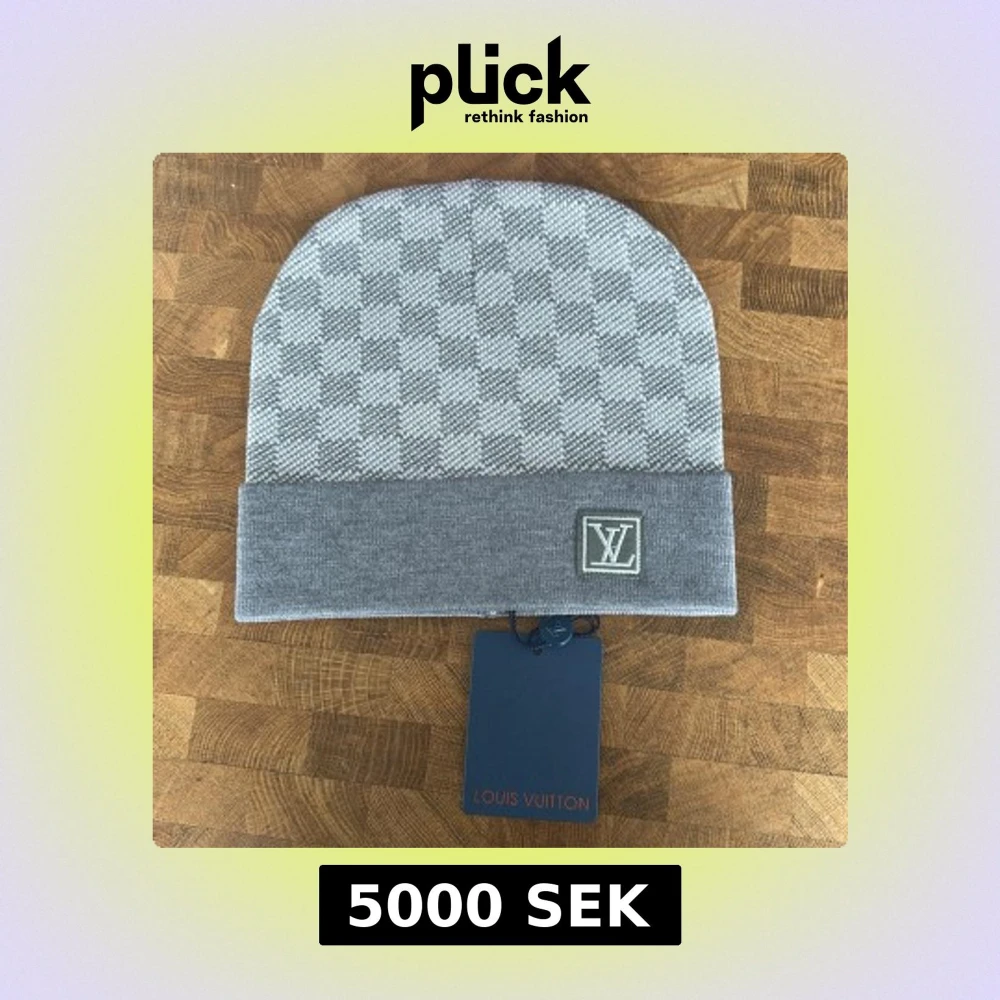 Snygg grå mössa från Louis Vuitton med diskret rutigt mönster och LV-logga framtill. Mössan har en vikt kant och är perfekt för att hålla värmen med stil.