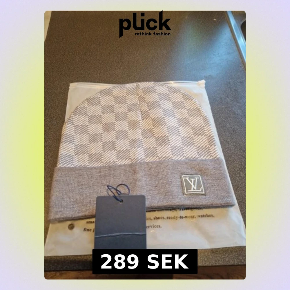 Säljer en snygg grå mössa från Louis Vuitton med klassiskt rutigt mönster och LV-logga framtill. Mössan har vikt kant och är tillverkad i mjukt material som känns skönt mot huden. Perfekt accessoar för att lyfta din outfit.