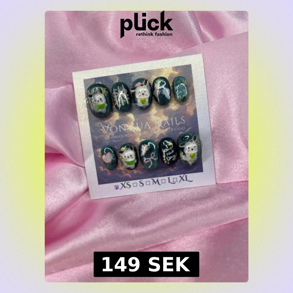 Handgjorda press on-naglar i en extra kort oval form med mörkgrön cateye bas och 3D-detaljer av söta sanriohunden, rosetter och text. Naglarna har inslag av vitt, rosa, gult och grönt samt glittriga accenter. Perfekt för dig som vill ha unika och lekfulla naglar.XS: 14 mm, 11 mm, 11,5 mm, 10 mm, 8 mm