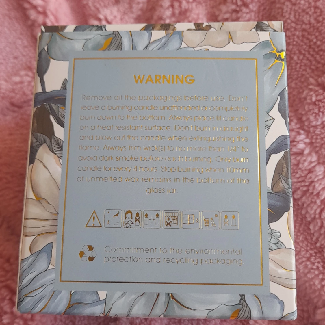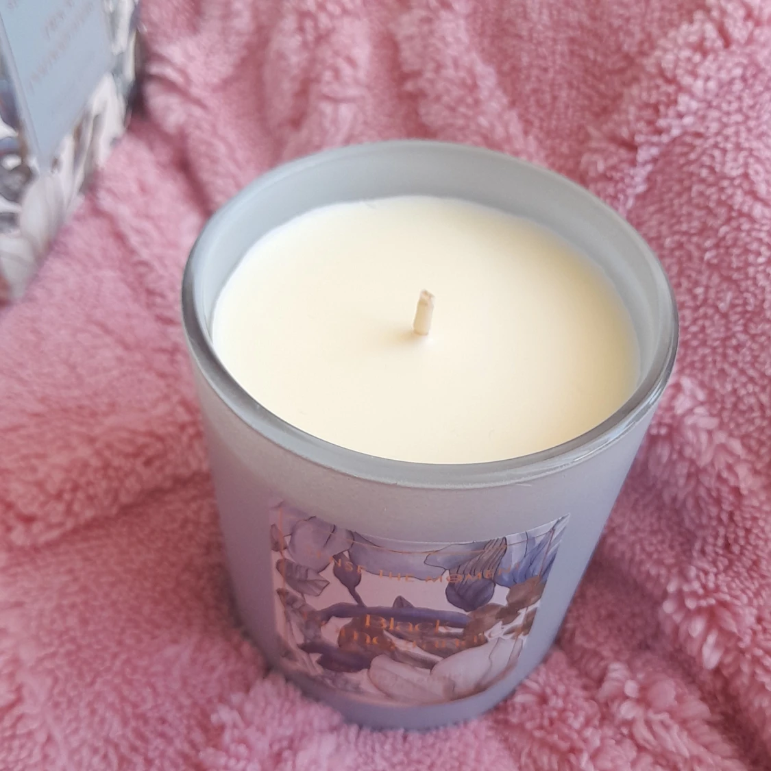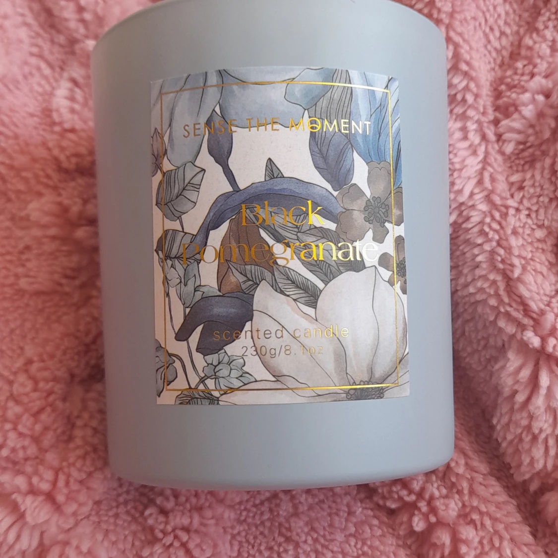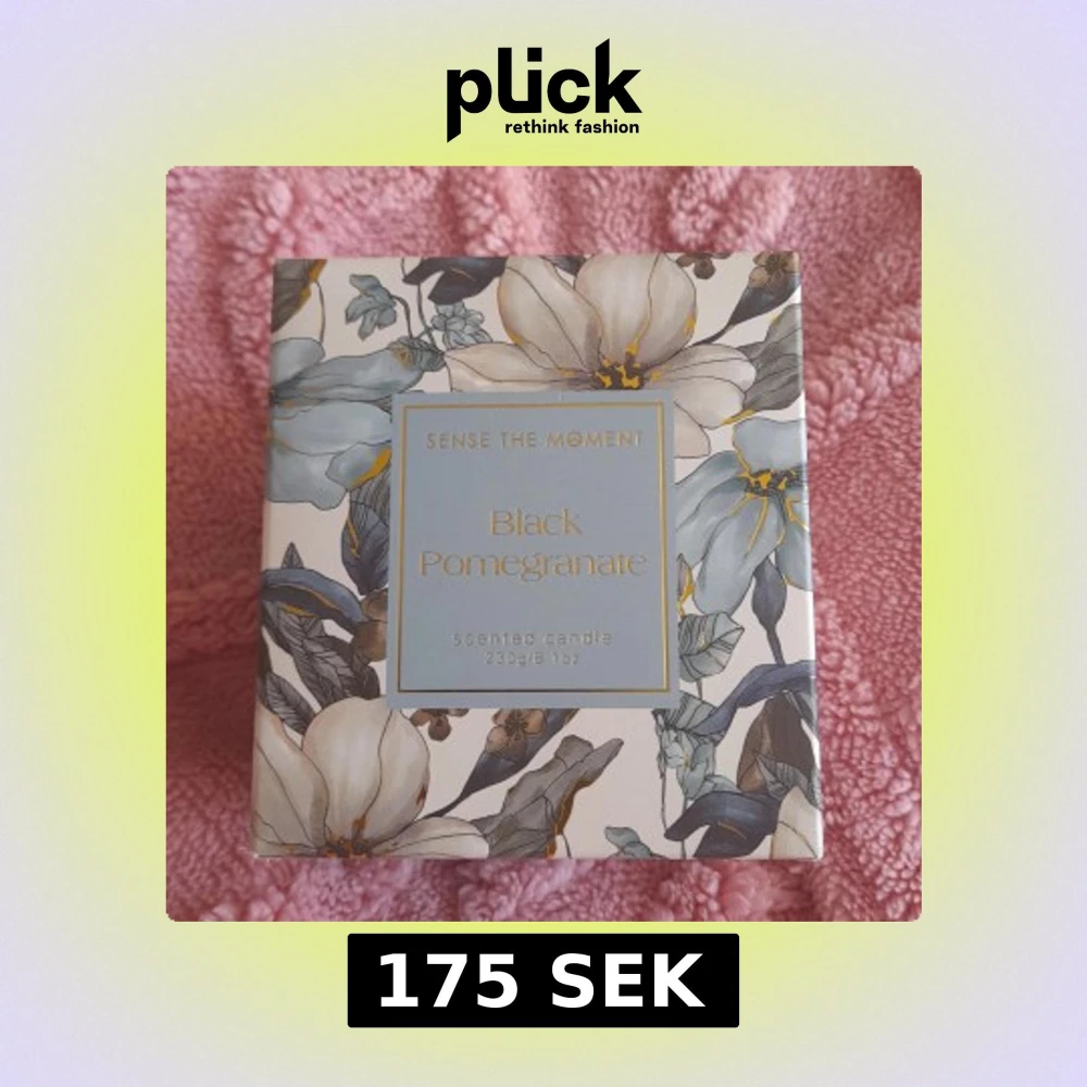 Säljer ett lyxigt doftljus i färgen ljusblå med doften Black Pomegranate. Ljuset väger 230g och kommer i en vacker förpackning med blommigt mönster i blått, vitt och guld. Perfekt för att skapa en mysig stämning hemma.