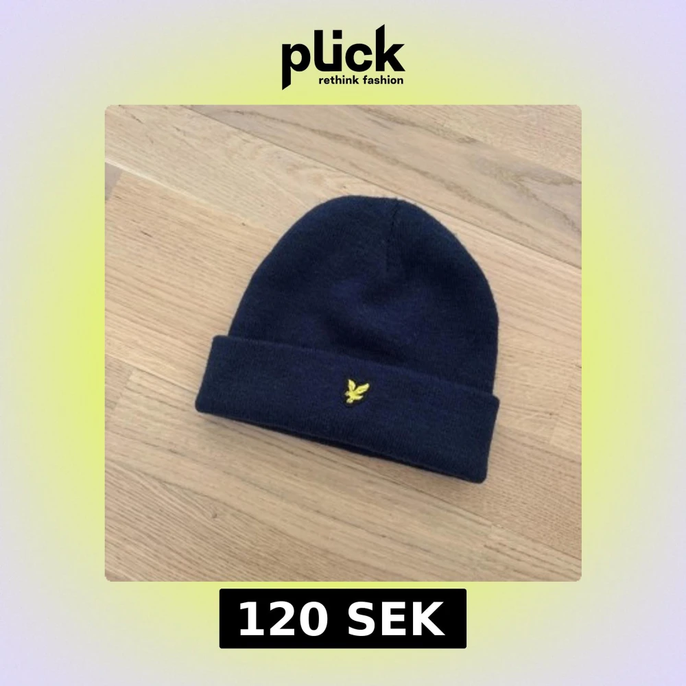 Snygg mörkblå stickad mössa med en gul broderad logga framtill. Perfekt för kyliga dagar och ger en stilren look. Passar bra till både vardag och utomhusaktiviteter.