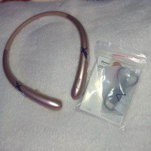 Ett par hörlurar som hålls fast vid nacken, lurarna kan dras ut så dom sitter bekvämt i öronen.