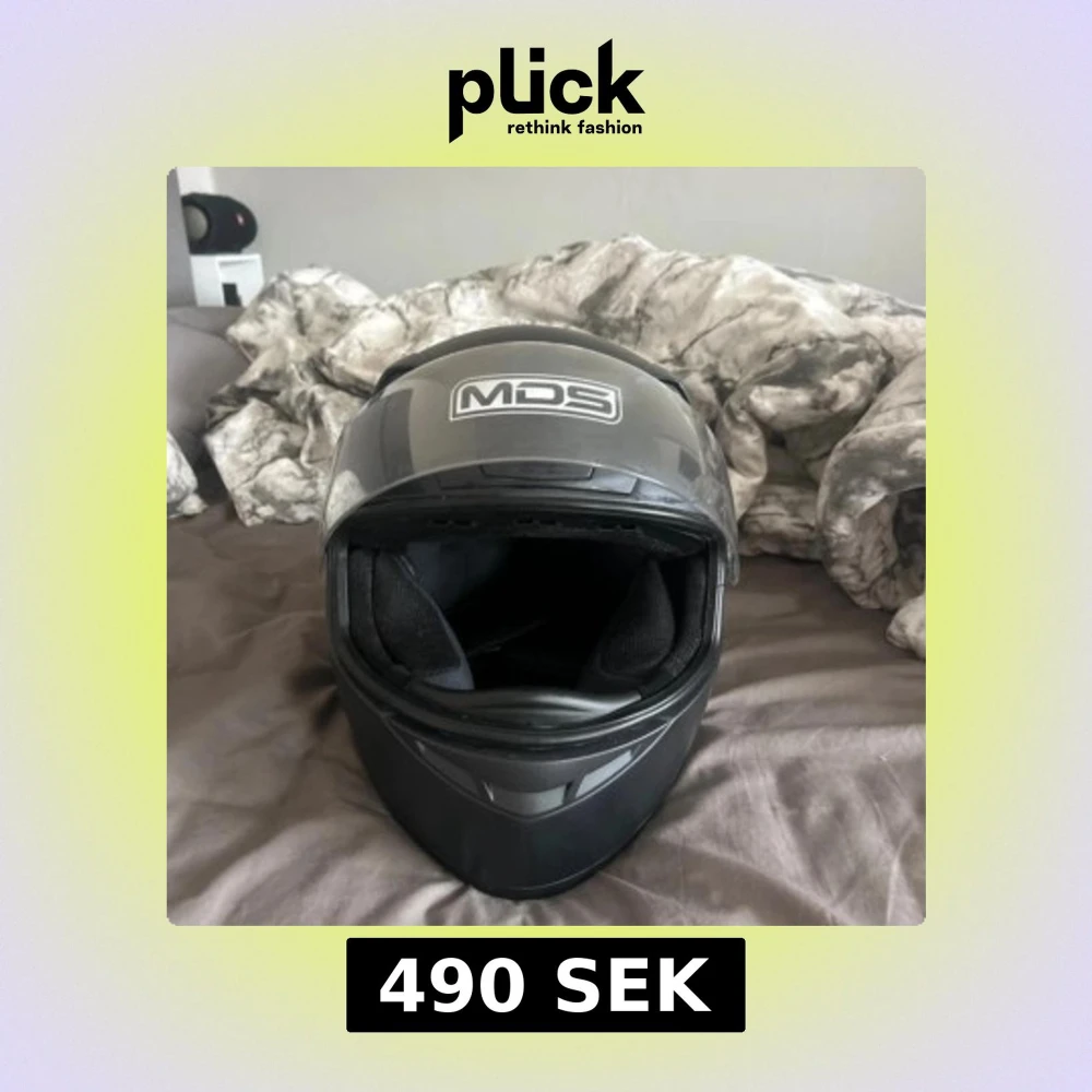 Säljer en svart motorcykelhjälm från MDS i storlek M. Hjälmen har visir framtill och vadderad insida för extra komfort. Snygg och stilren design med MDS-logga framtill.