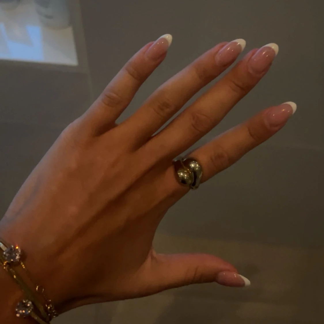 Säljer en chunky silverring med cool, böljande design. Ringen har en blank yta och känns riktigt trendig och stilren. Perfekt för dig som gillar statement-smycken och vill sticka ut lite extra.