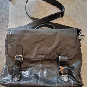 Laptopväska i läder med vaddering och extra fack. Ställbar axelrem. Höjd 30 cm, bredd 40 cm, djup 9 cm.
