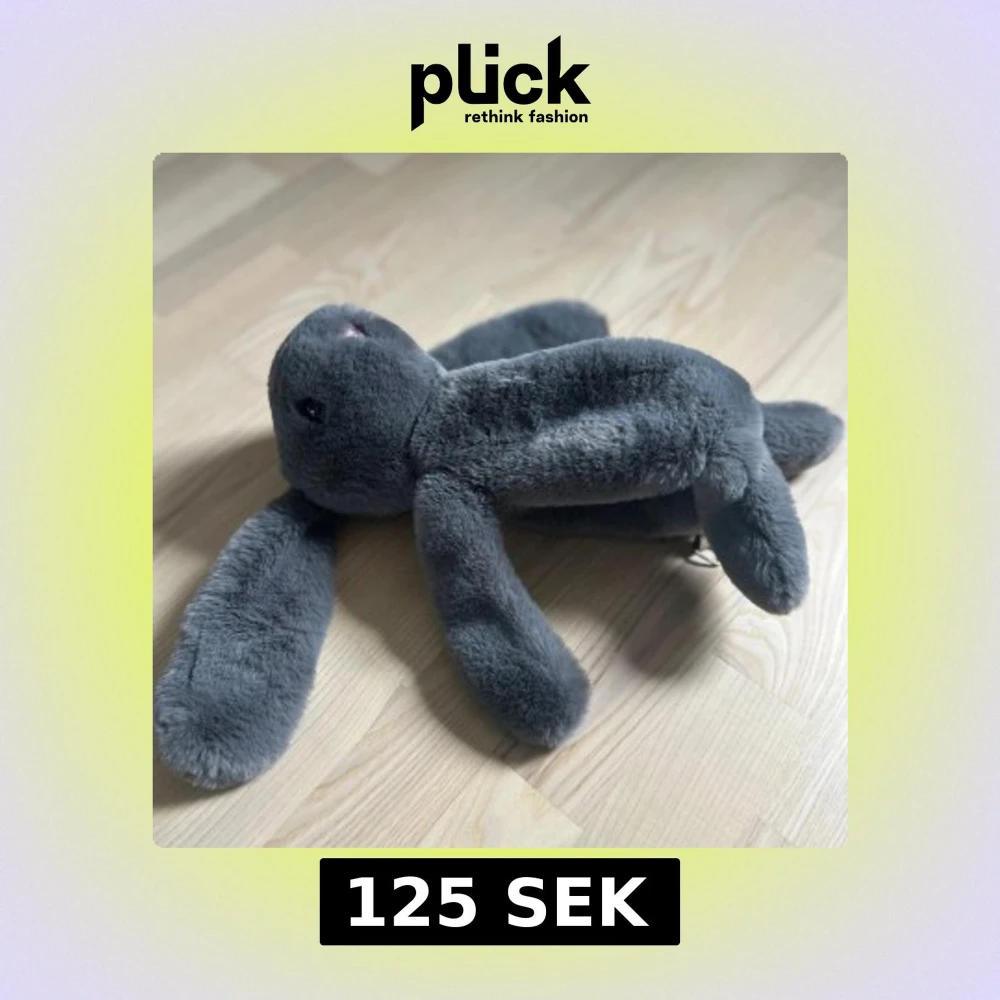 Supermjuk och fluffig kanin i mörkgrå plysch med långa öron och svans. Perfekt som mysig kompis eller dekoration. Kaninen har broderade ögon och näsa.( Väska)