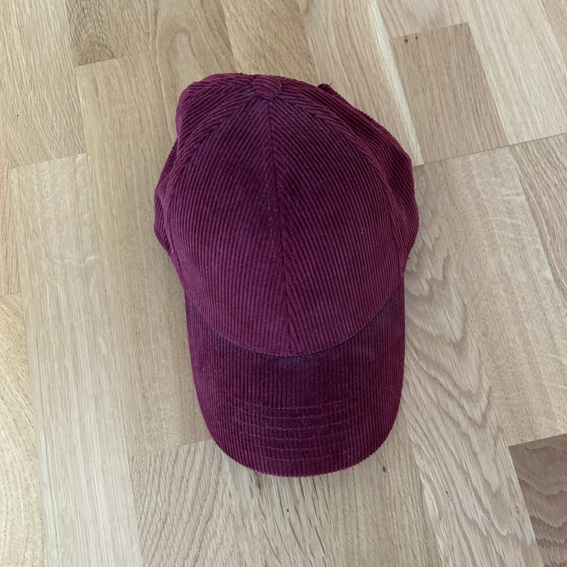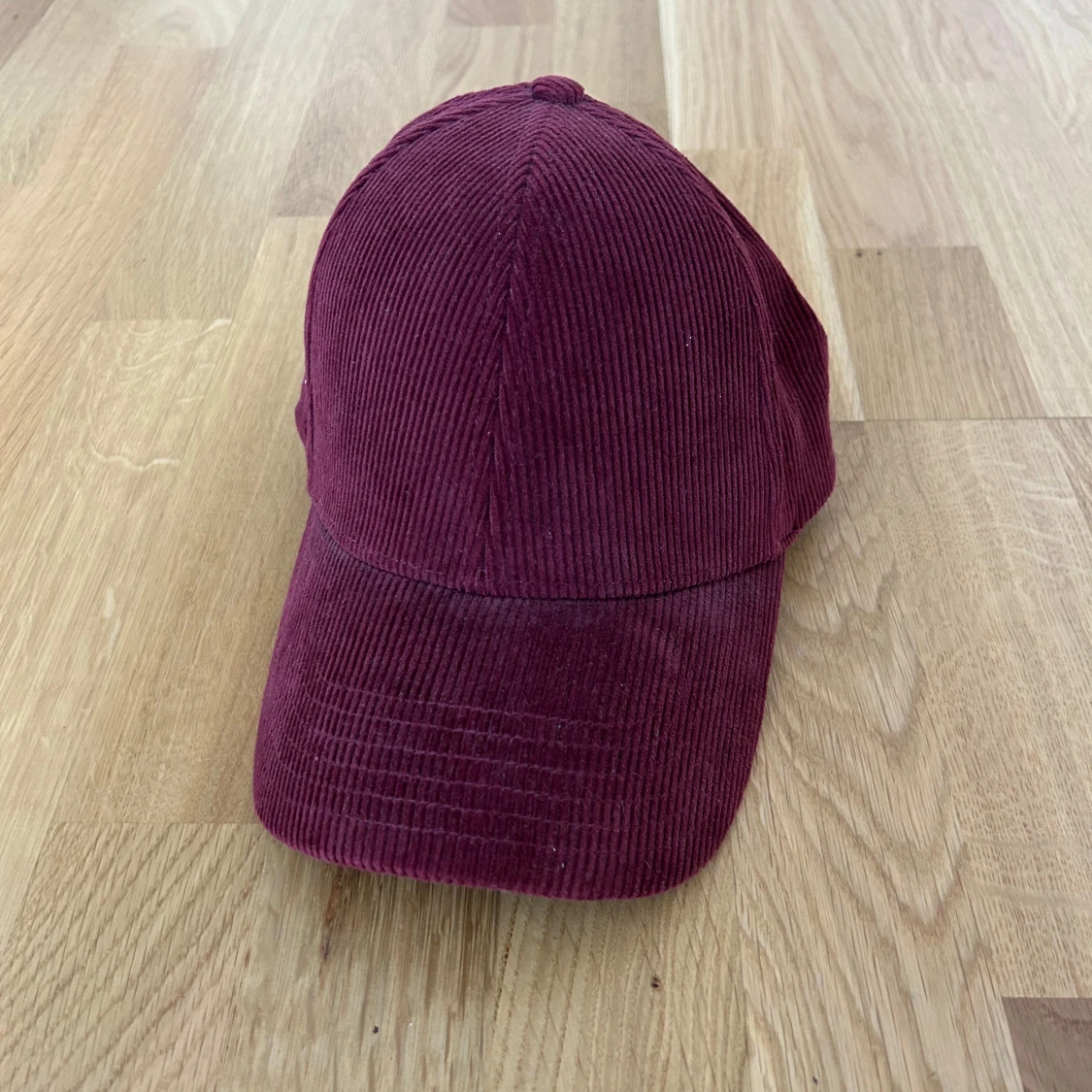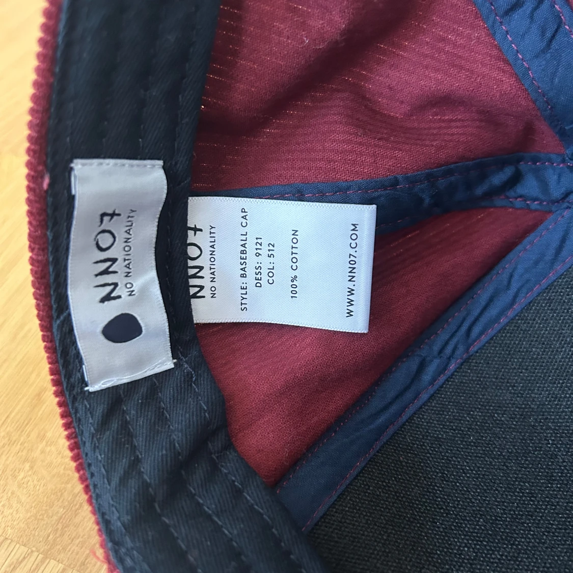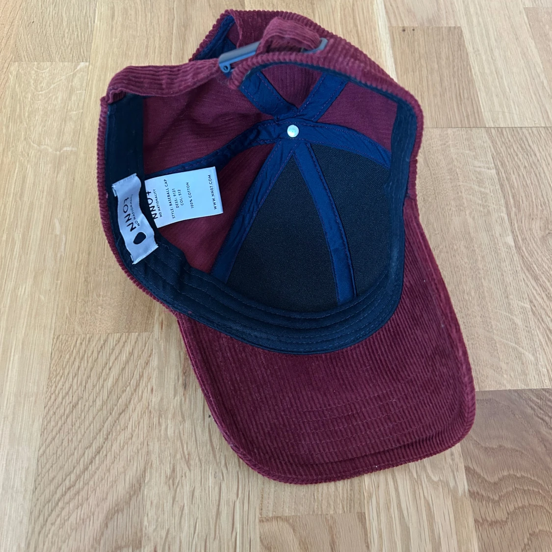 Vinröd keps från NN07 i mjuk manchester med klassisk böjd skärm och justerbar rem bak. Nyskick.