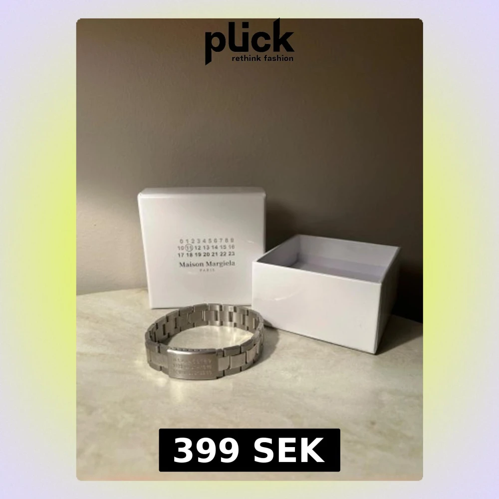 Snyggt armband från Maison Margiela i silverfärgat rostfritt stål. Länkarna är breda och har en modern, chunky design. Plattan framtill har Margielas ikoniska siffror ingraverade. Kommer med original vit box.