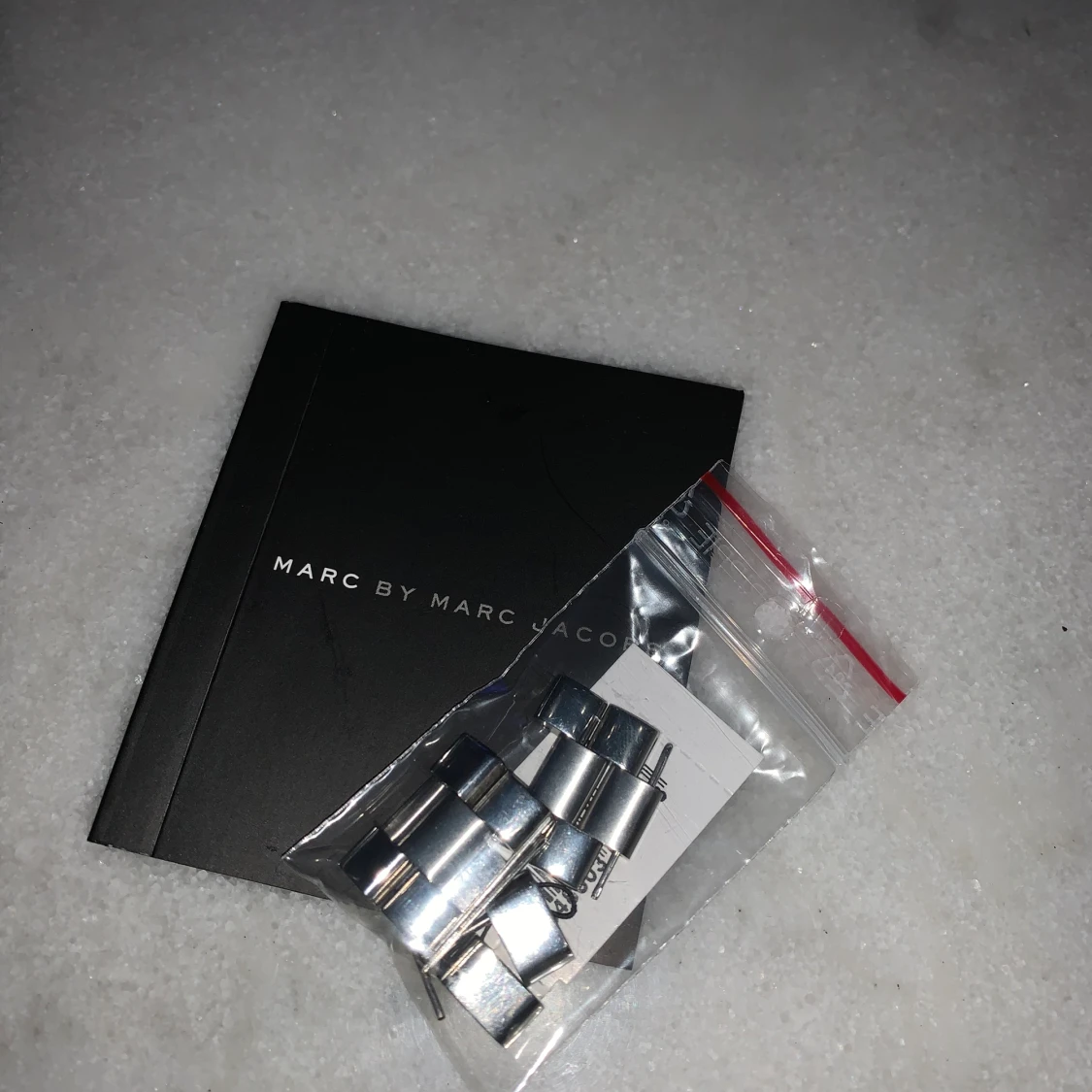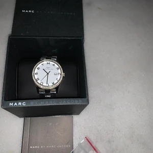 Marc By Marc Jacobs i med silverlänk med strass runt omkring urtavlan. Använd 1-3 gånger. Fått i present så har dessvärre inget kvitto. Men allt annat medföljer, kartong, extra länkar, bok m.m. Då klockan inte är använd på ett tag behöver den nytt batteri. Kostar ungefär 100kr hos en urmakare.