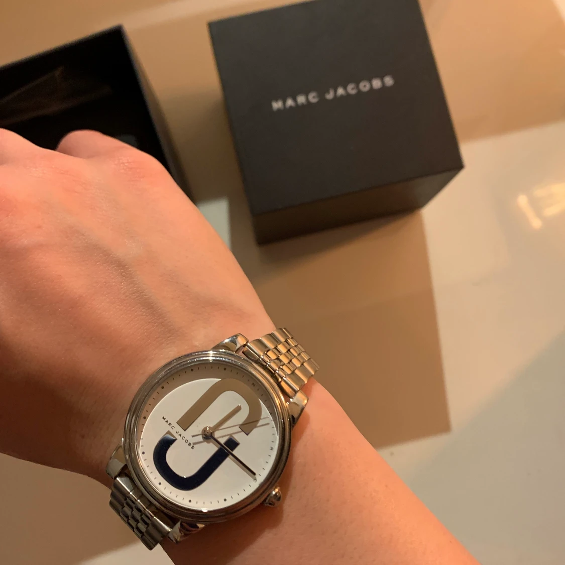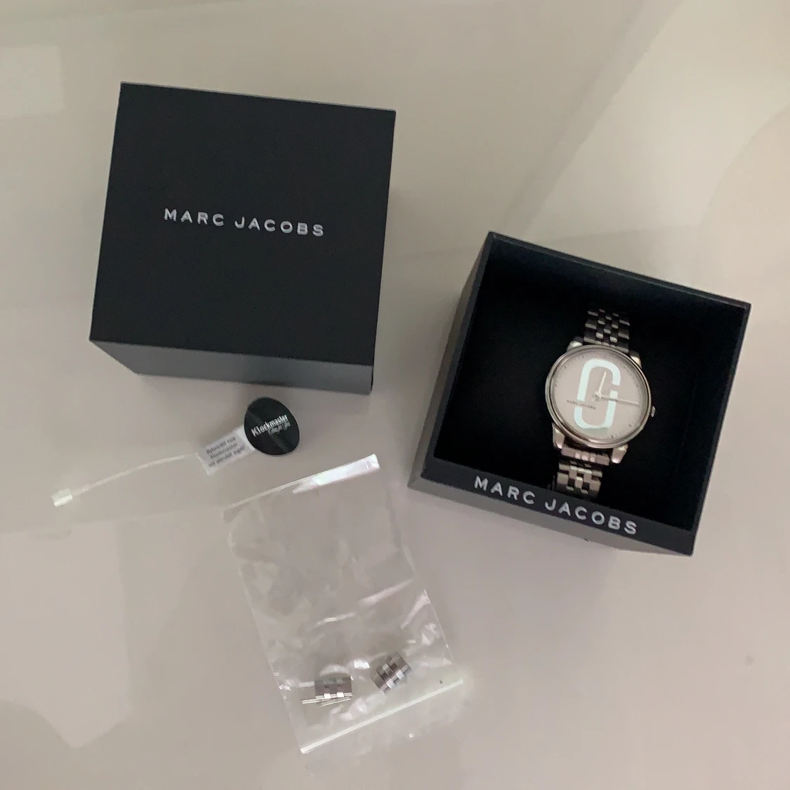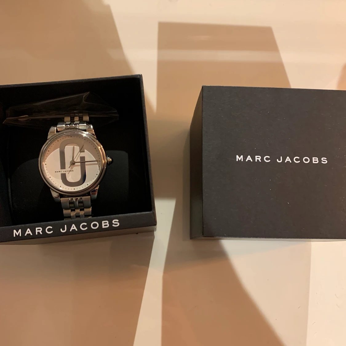 Marc Jacobs klocka som är använd endast ett fåtal gånger. Analogstid visas med tre visare, streck, punkter och bokstäver. Klockan 36cm bred och har ett reptåligt mineralglas. Frakten är inräknad i priset
