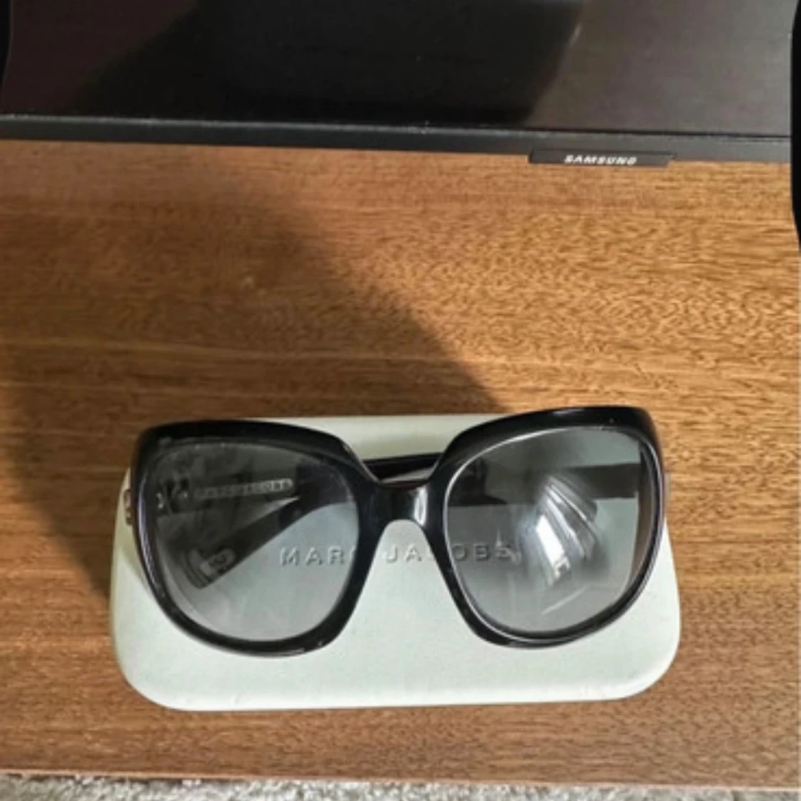 Snygga svarta solglasögon från Marc Jacobs med stora, fyrkantiga bågar och mörka glas. Kommer med originalfodral i vitt. I bra skick.