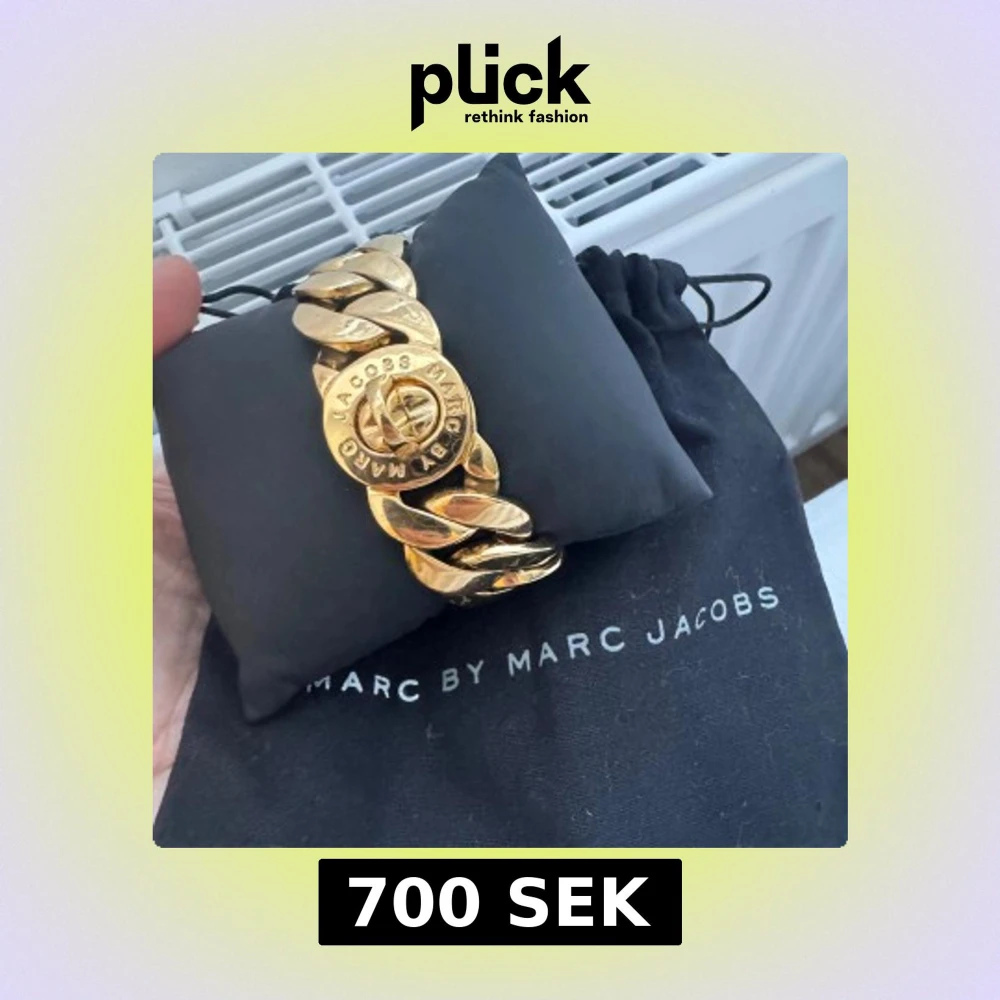 Snyggt guldarmband från Marc by Marc Jacobs med breda länkar och en rund detalj med logotyp. Perfekt för att ge en lyxig touch till din outfit. Kommer med en svart förvaringspåse.