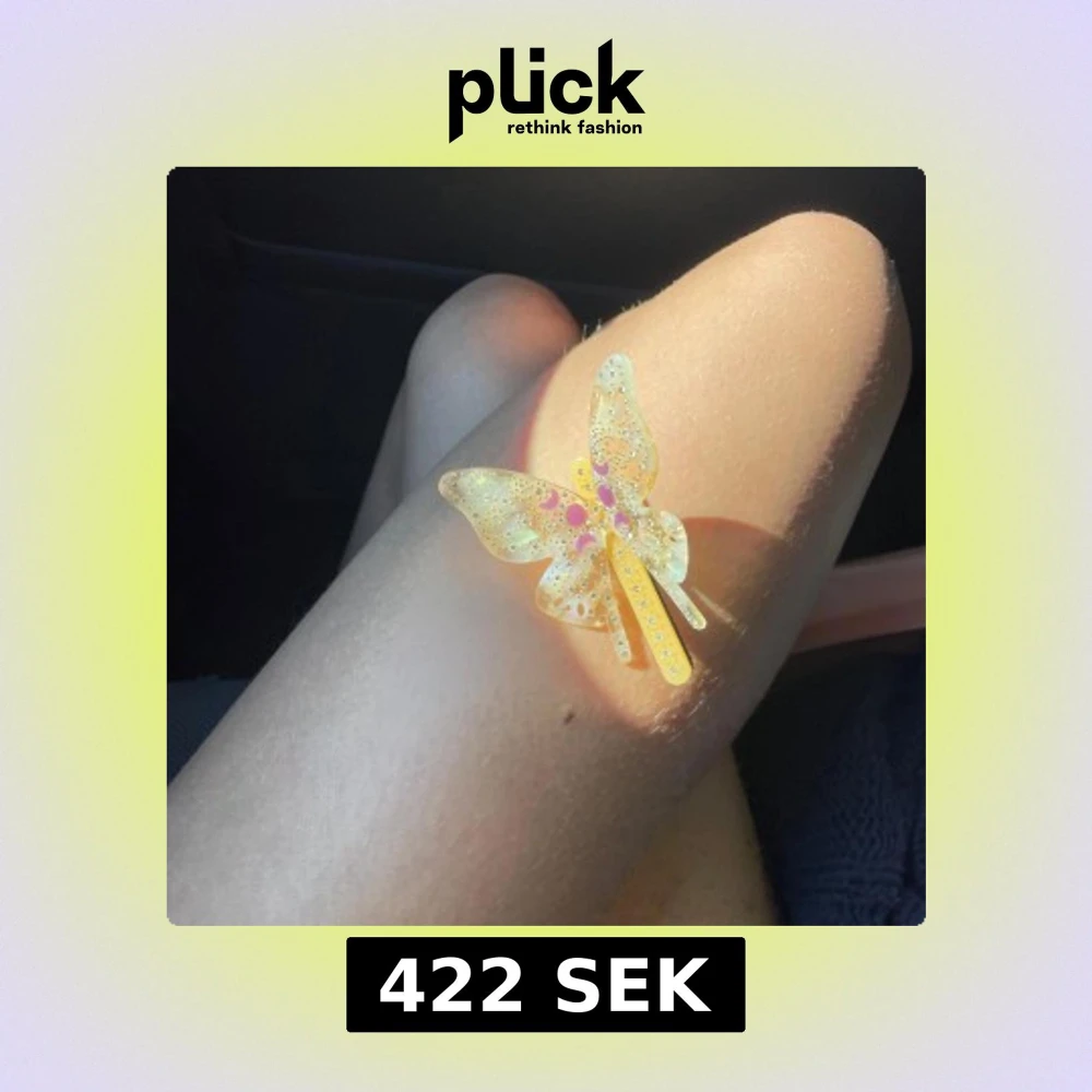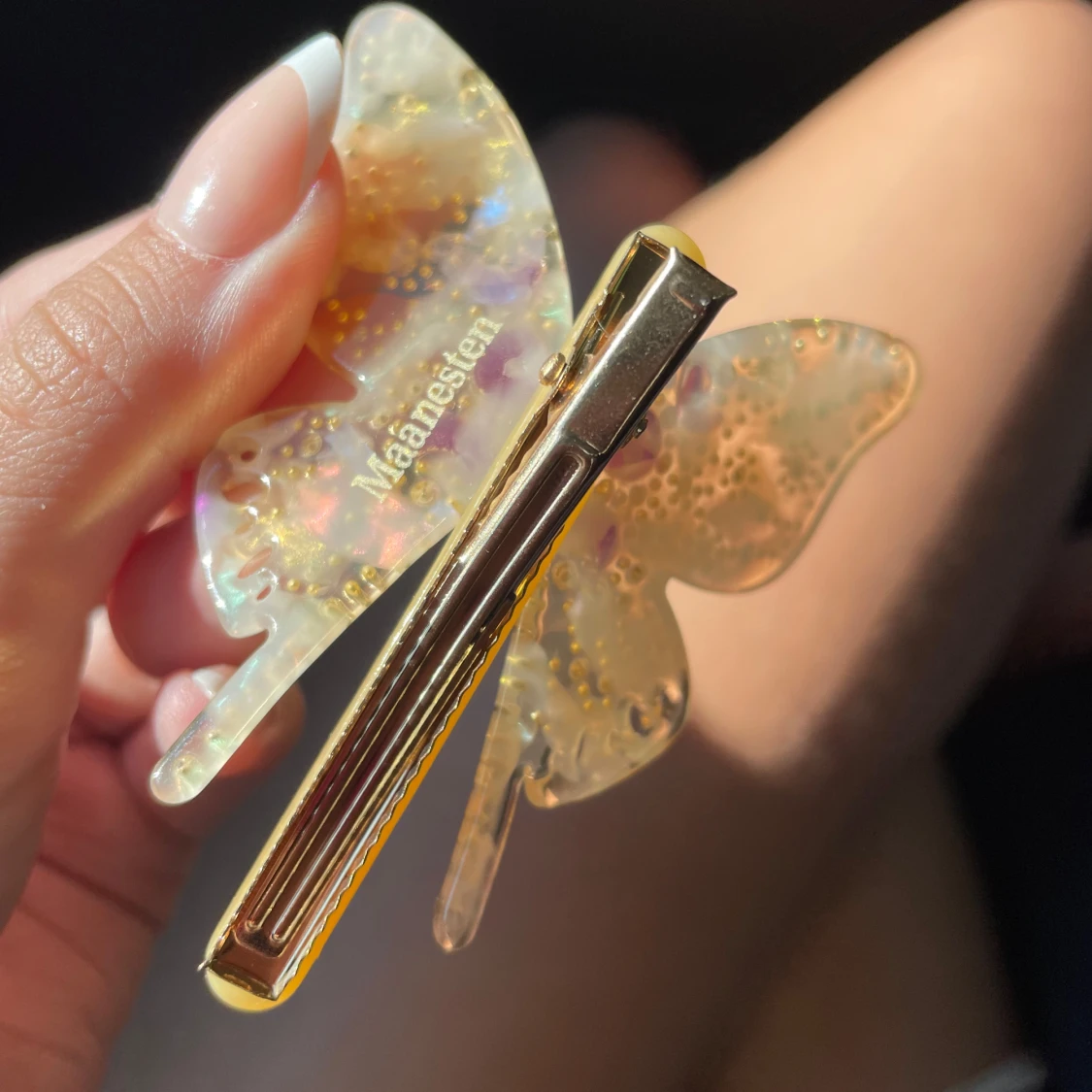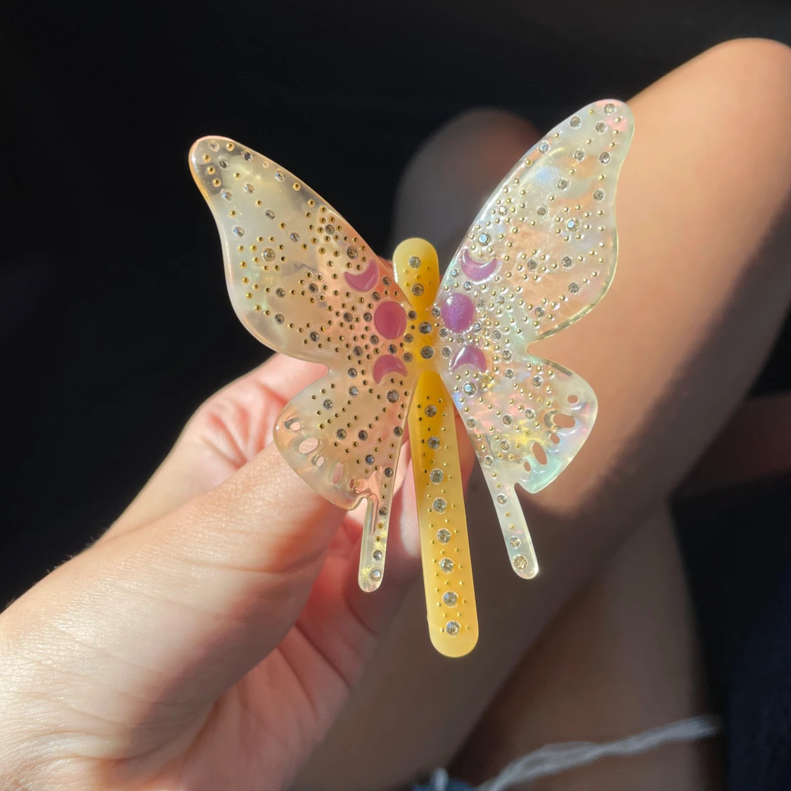 Superfint hårspänne från Maanesten i form av en fjäril. Spännet är skimrande med inslag av gult, lila och rosa samt små glittriga detaljer.