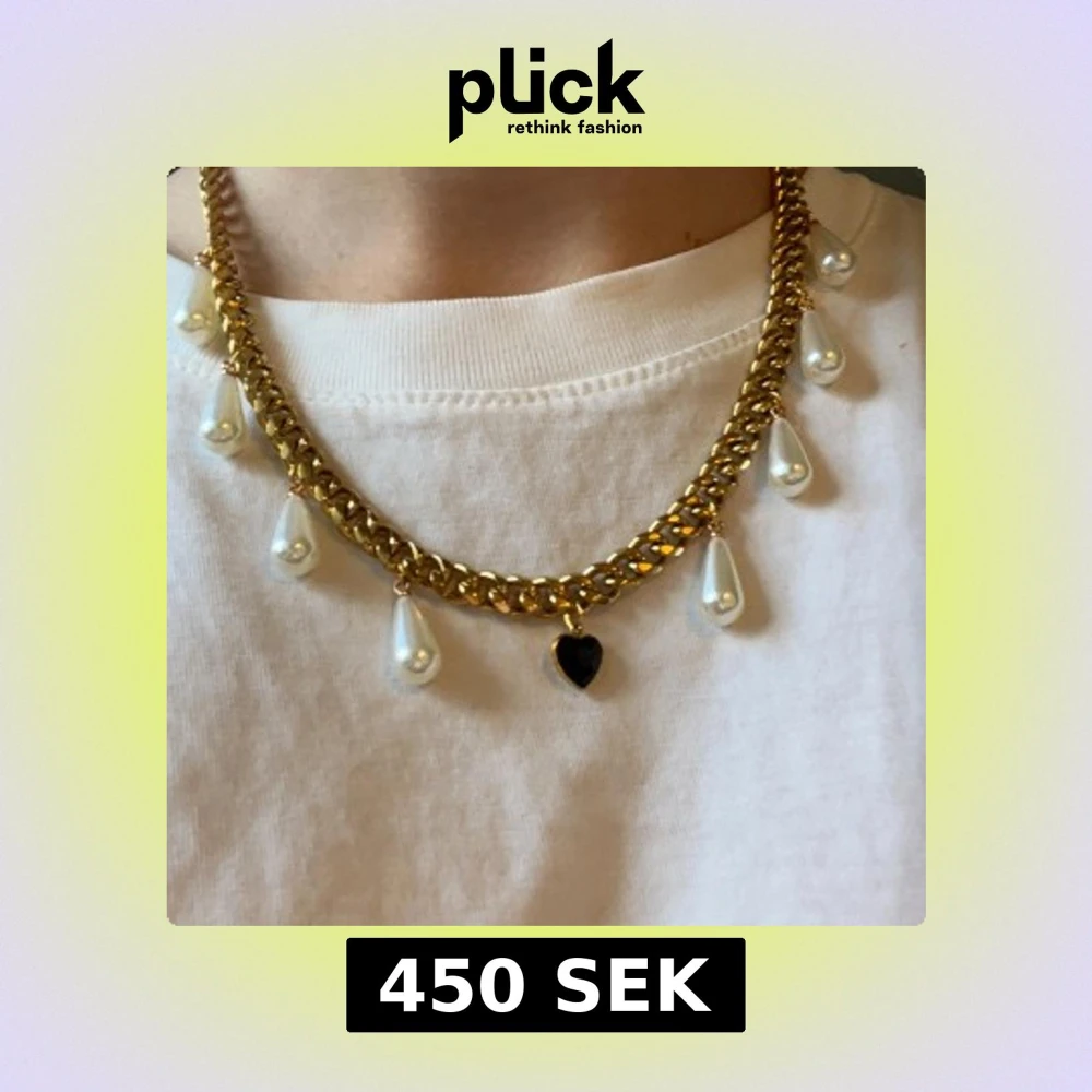 Unikt halsband i guldton med chunky kedja, dekorerat med vita pärldroppar och ett svart hjärthänge i mitten. Perfekt statement piece för dig som vill sticka ut och addera lite lyxig vibe till din outfit.