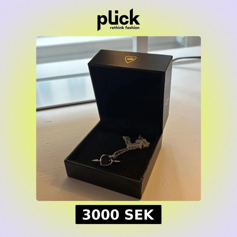 Elegant halsband från Maria Nilsdotter med ett hjärtformat hänge i silver och en mörkröd sten. Hänget har spetsiga detaljer på sidorna och kedjan är fin och tunn. Längd 40
