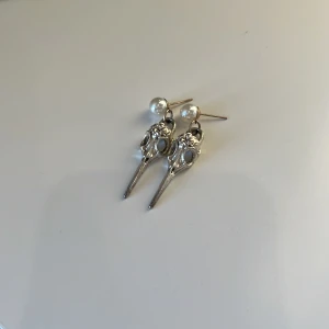 Unika örhängen i silverfärg med en pärldetalj vid fästet. Designen har en intressant form som påminner om en fågelnäbb, vilket ger en edgy och stilren look. Perfekta för att ge en extra touch till din outfit.