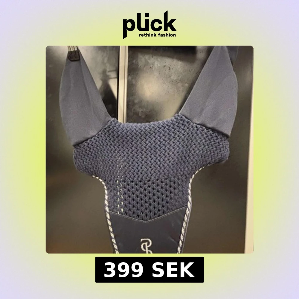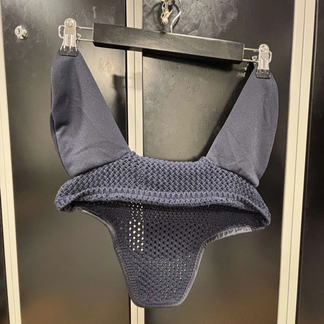 Säljer en snygg marinblå ridhuva från PS med stickad mittdel och släta tygöron. Huva har broderad logga framtill och dekorativ kant i vitt och blått. Perfekt för att dämpa ljud och ge hästen en stilren look under ridning.