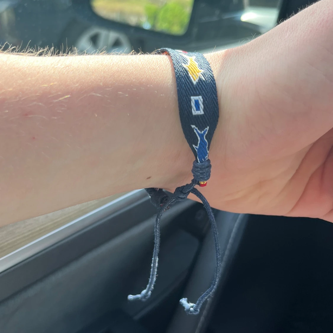 Snyggt marinblått armband med broderade signalflaggor i rött, blått, gult och vitt. Armbandet har knytning för justerbar storlek och är gjort i ett mjukt tygmaterial. Perfekt accessoar för dig som gillar havet och vill ha en färgglad detalj på handleden.