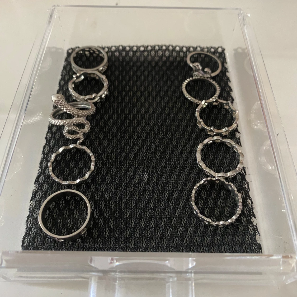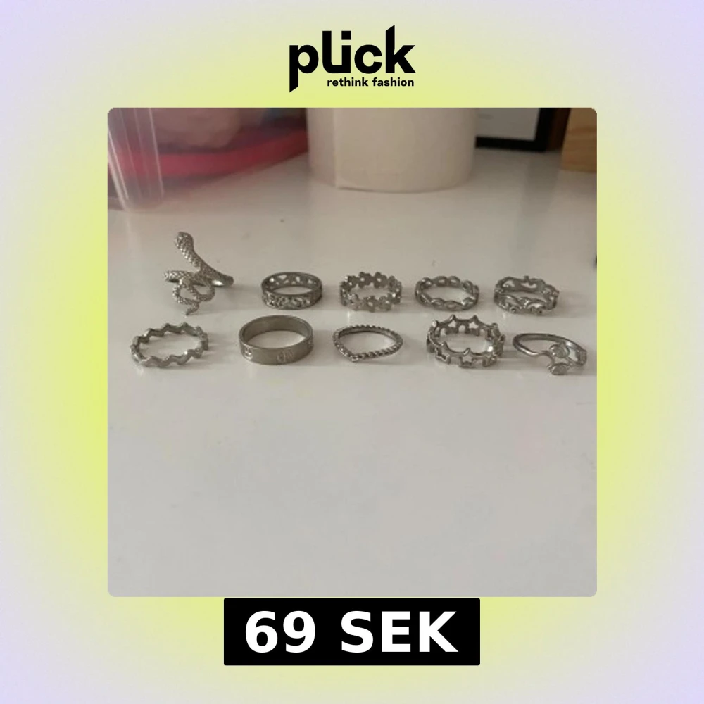 Säljer ett set med 10 silvriga ringar i olika coola former, bland annat en ring formad som en orm, vågiga och flätade mönster samt ringar med stjärnor och hjärtan. Alla ringar är i metall och har en trendig vibe, perfekta för att mixa och matcha på flera fingrar.😍Aldrig använda och passar mina fingrar (smala och små)💕Passar som present eller gåva❤️
