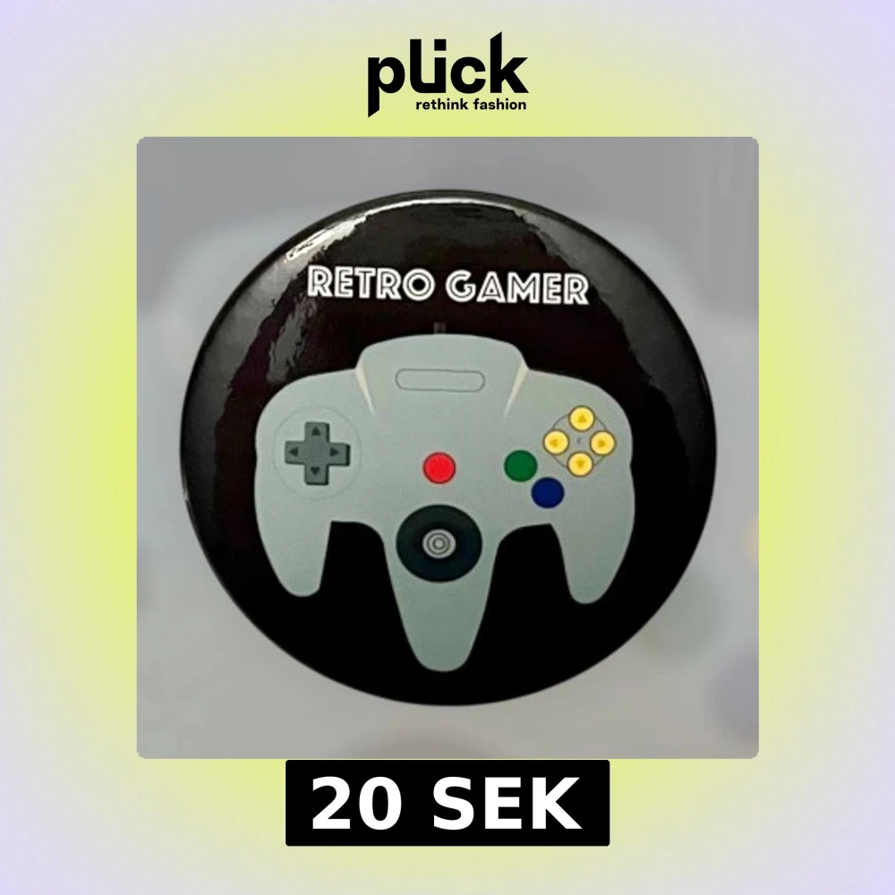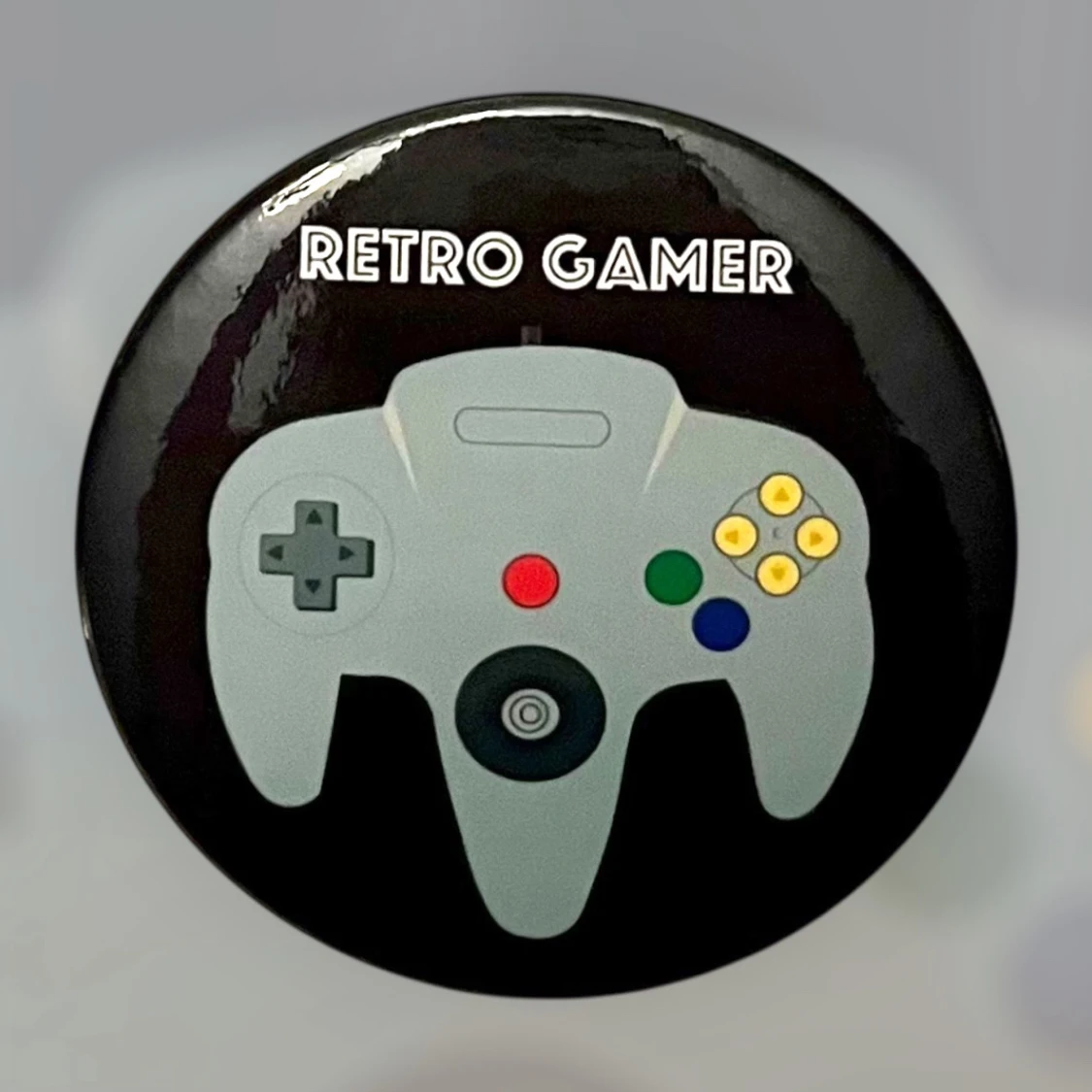En snygg pin med en N64 handkontroll och texten RETRO GAMER. Ca 4,4 cm i diameter. Perfekt för den som älskar Nintendo och gamla tv-spel!