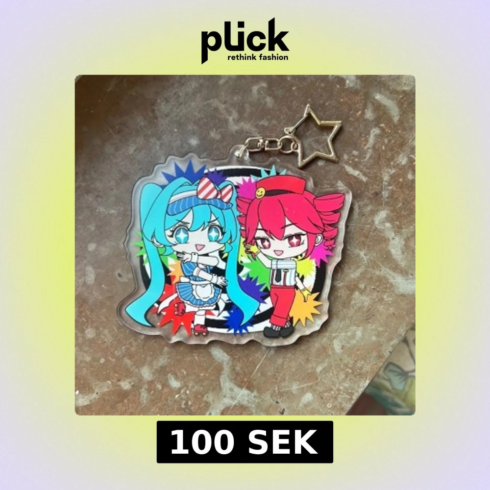 Keychain of Hatsune Miku and Kasane Teto from Mezmerizer! Perfect for your bag decorations or collection :) (There might be scratches on the surface but that’s only on the protective layer of plastic, peel it off on both sides and it’ll be perfectly shiny!)