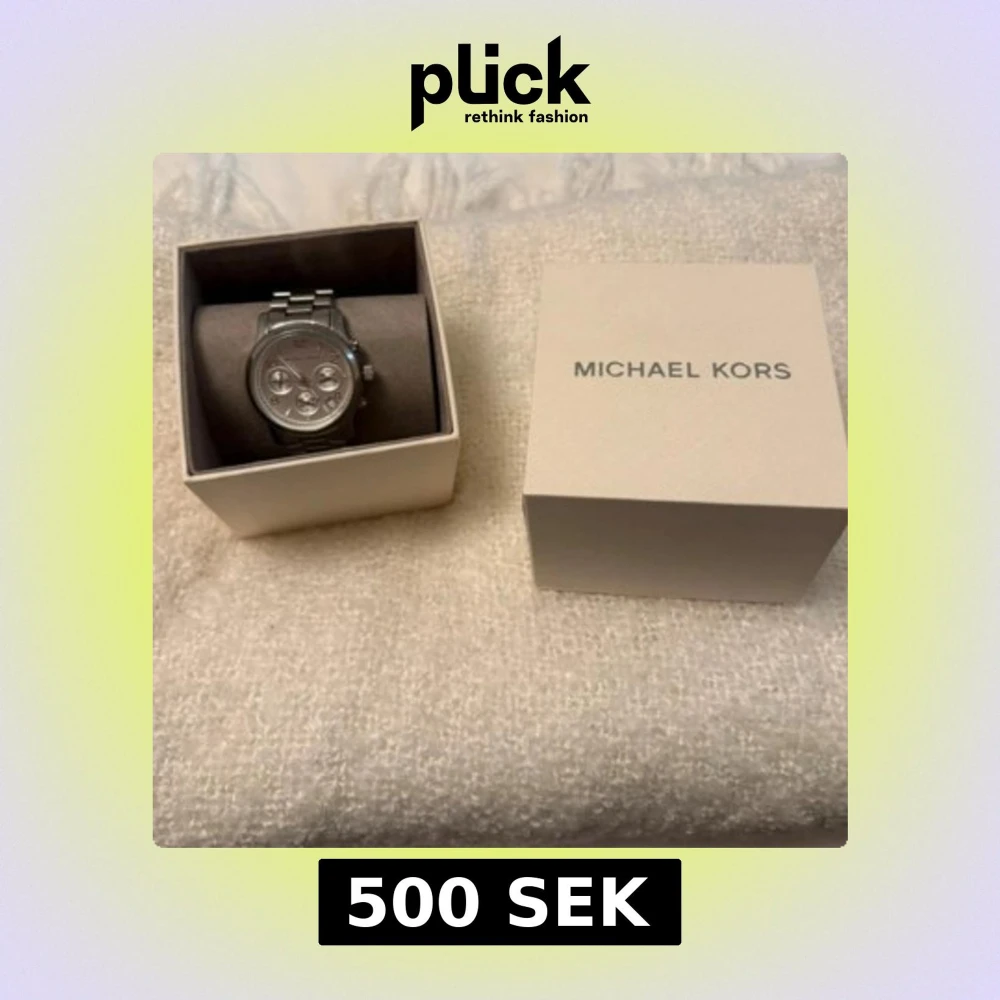 Säljer en stilren klocka från Michael Kors i silverfärgat metall med klassisk länkarmband. Klockan kommer i originalförpackning och har en rund urtavla med detaljerade knappar på sidan. Perfekt accessoar för dig som gillar snygga detaljer.