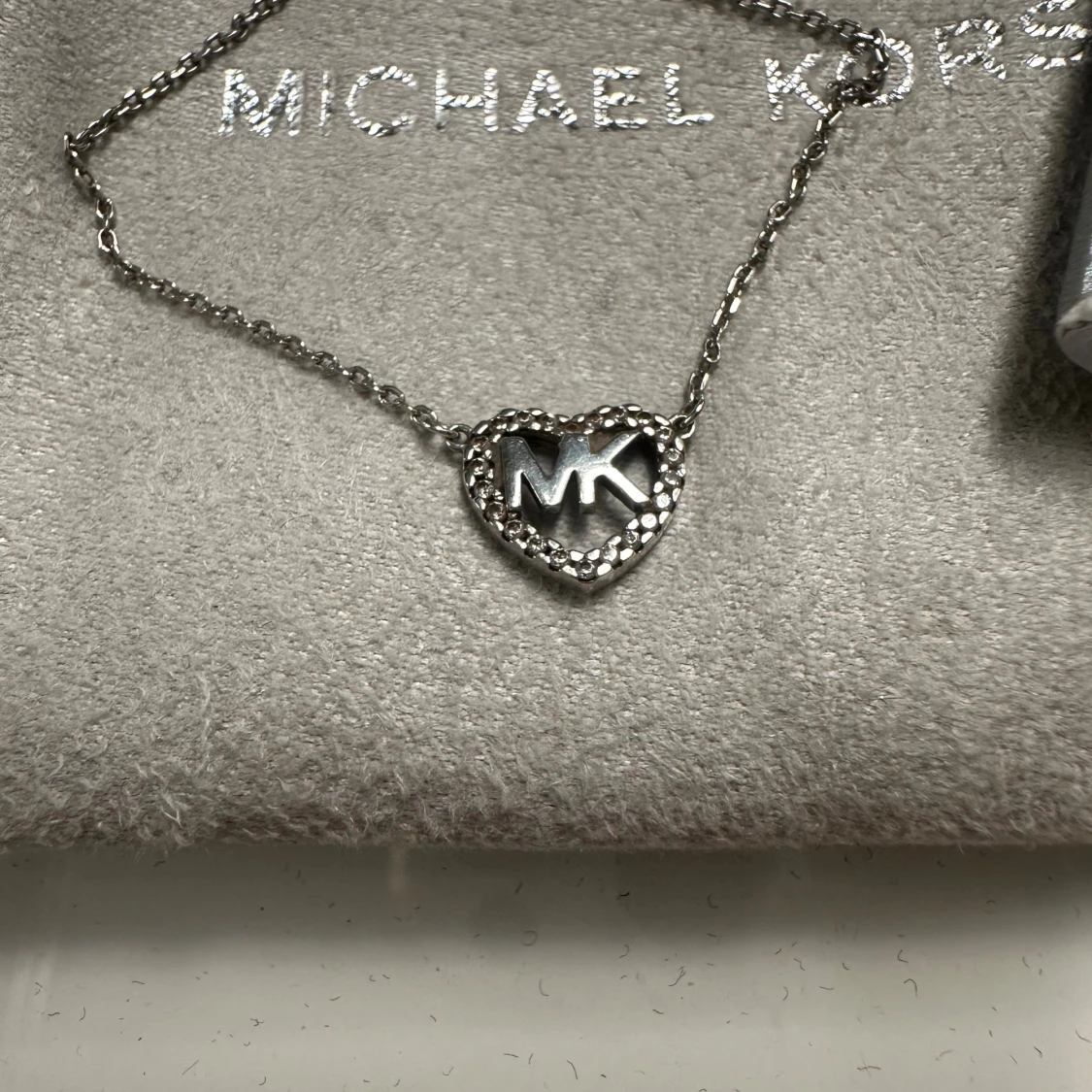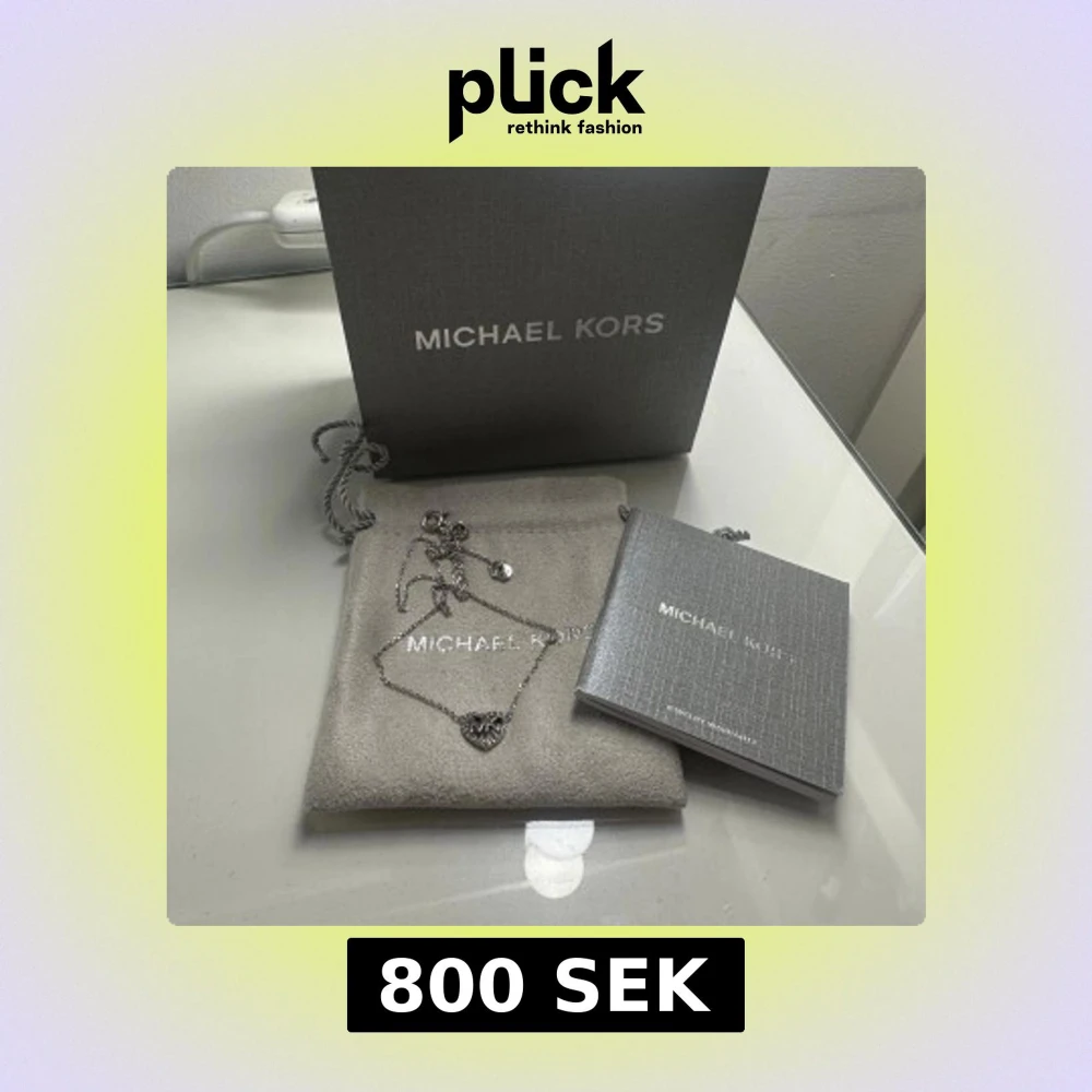 Snyggt silverfärgat halsband från Michael Kors med ett hjärtformat hänge dekorerat med små glittriga stenar och MK-logga i mitten. Kedjan är tunn och elegant, perfekt för att ge din outfit en lyxig touch. Levereras med originalpåse och ask. Nypris 1500