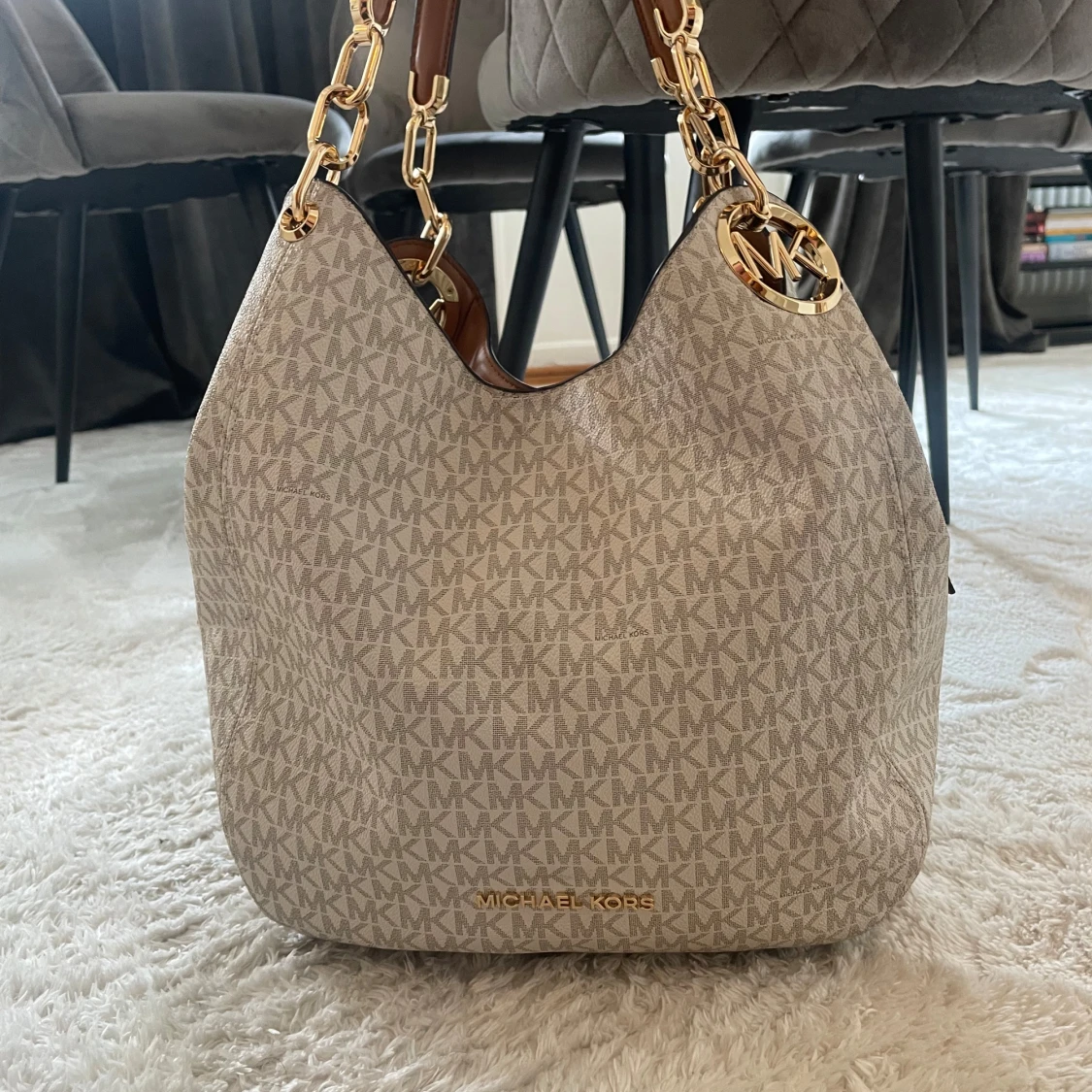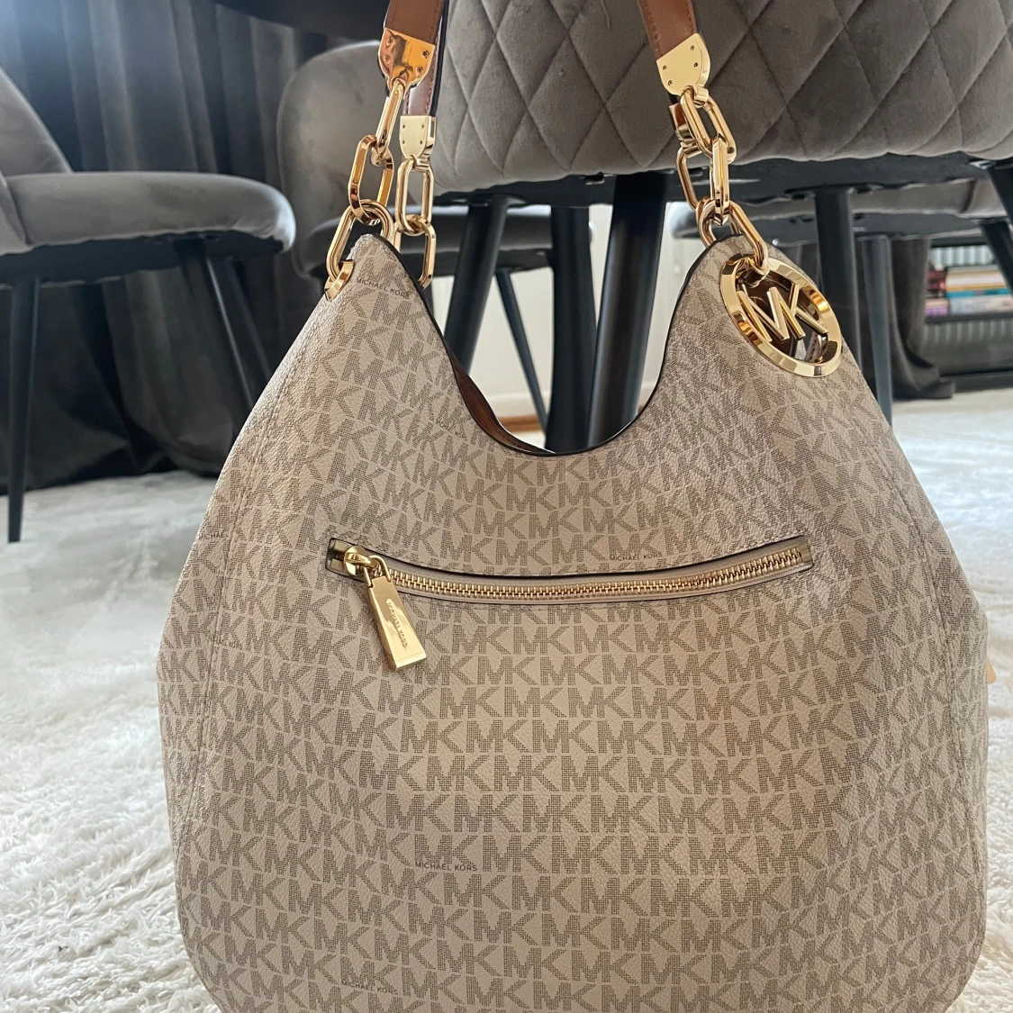 Köpt i Michael kors butiken i mall of Scandinavia för ett par månader sen, väskan är i ny skick och dustbagen medföljer. Nypris: 5000 kr