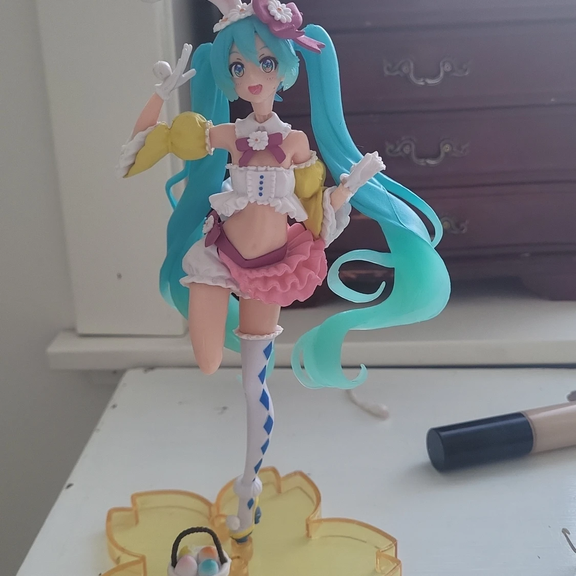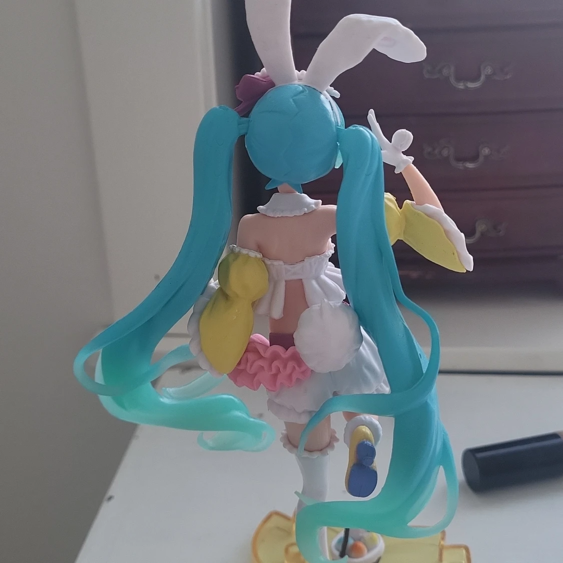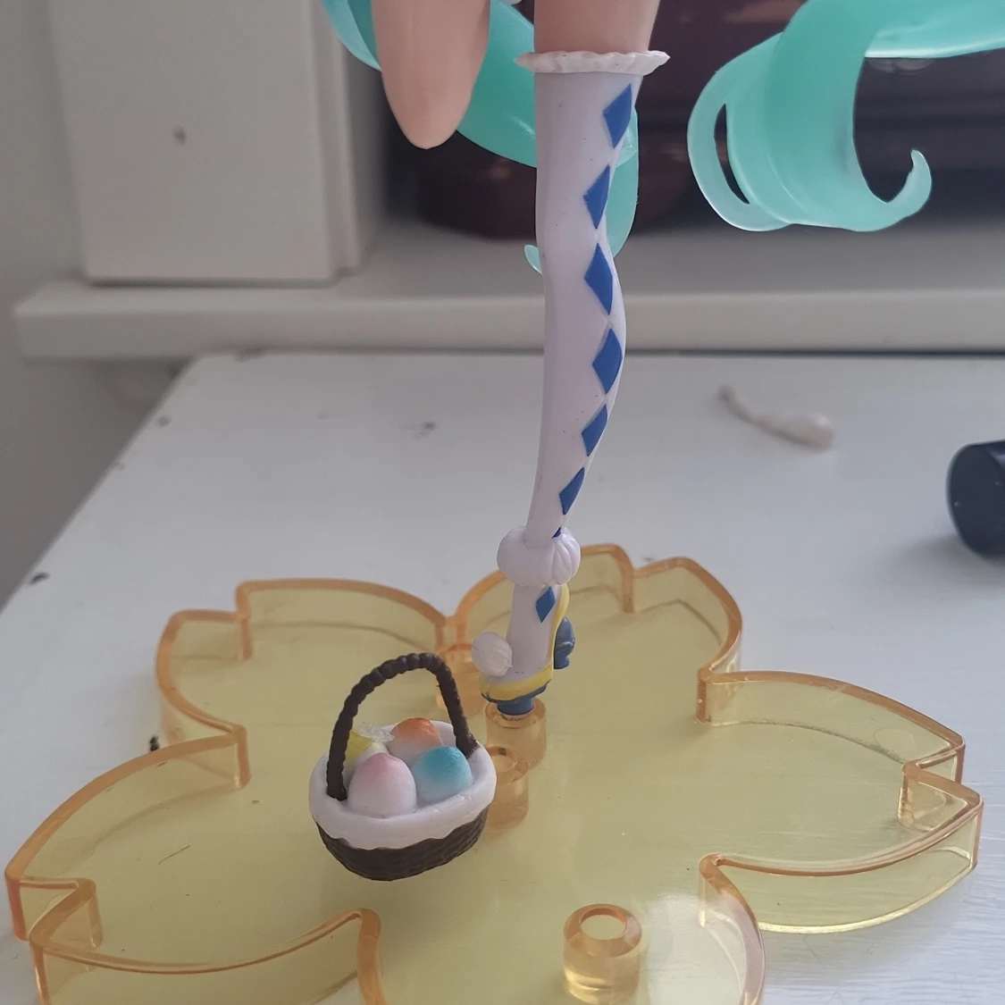 En färgglad figur av en karaktär med långt turkost hår och kaninöron. Figuren har en vit och rosa outfit med gula detaljer och står på en gul bas. Den har också en liten korg med ägg vid fötterna. Hat använt den typ en gång, stondet kommer med