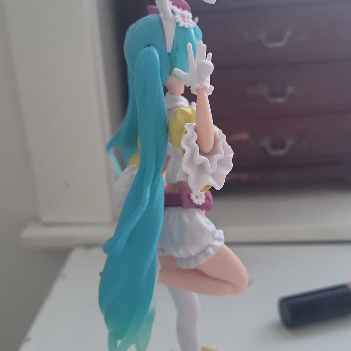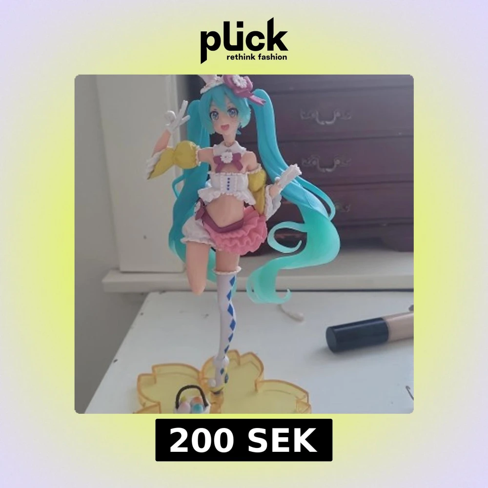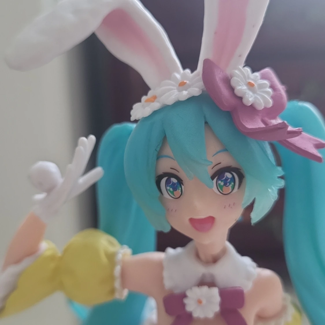 En färgglad figur av en karaktär med långt turkost hår och kaninöron. Figuren har en vit och rosa outfit med gula detaljer och står på en gul bas. Den har också en liten korg med ägg vid fötterna. Hat använt den typ en gång, stondet kommer med