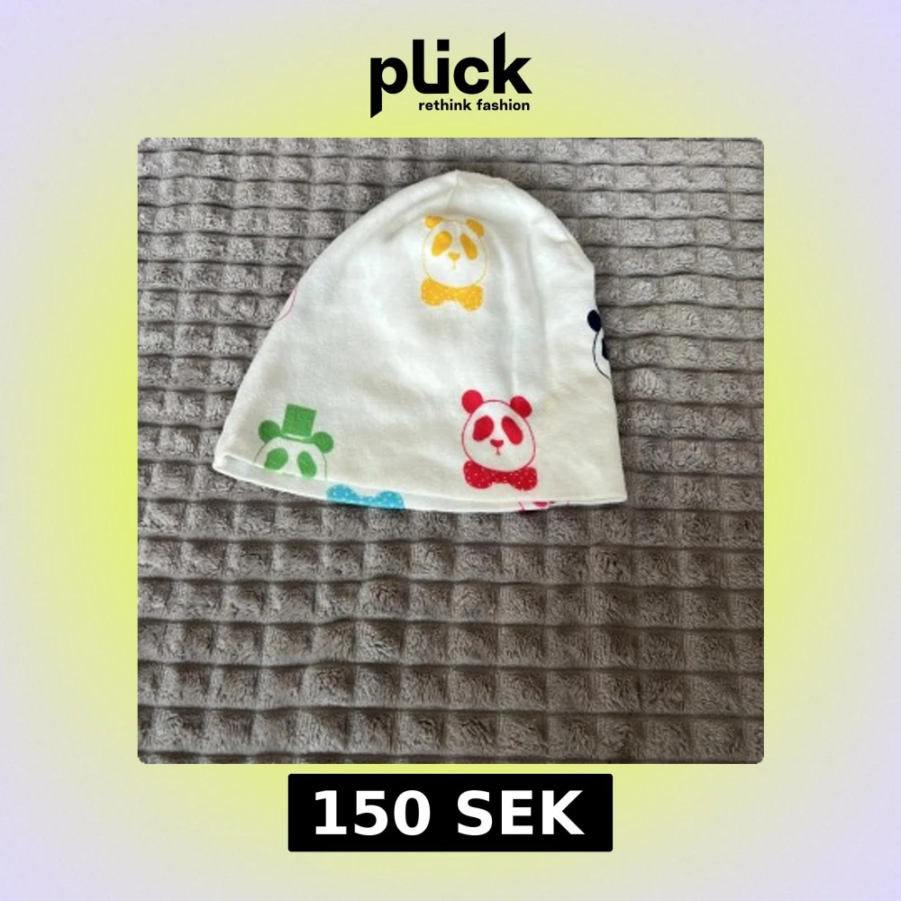 Söt vit mössa med färgglada pandor i gult, grönt, rött och blått. Perfekt för att liva upp vilken outfit som helst!