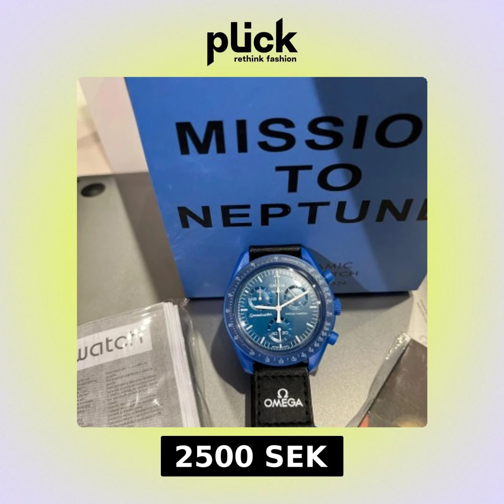 Säljer en blå Omega x Swatch Speedmaster MoonSwatch Mission to Neptune. Klockan har blå boett och blå urtavla med vita detaljer och svart textilband med Omega-logga. En sportig och unik klocka för dig som gillar cool design och rymdtema.