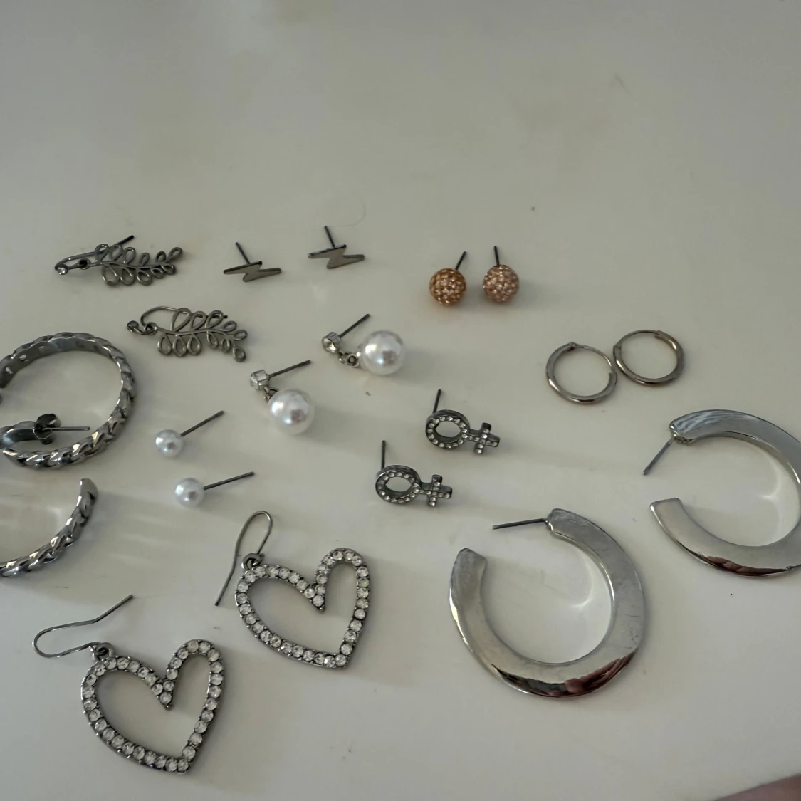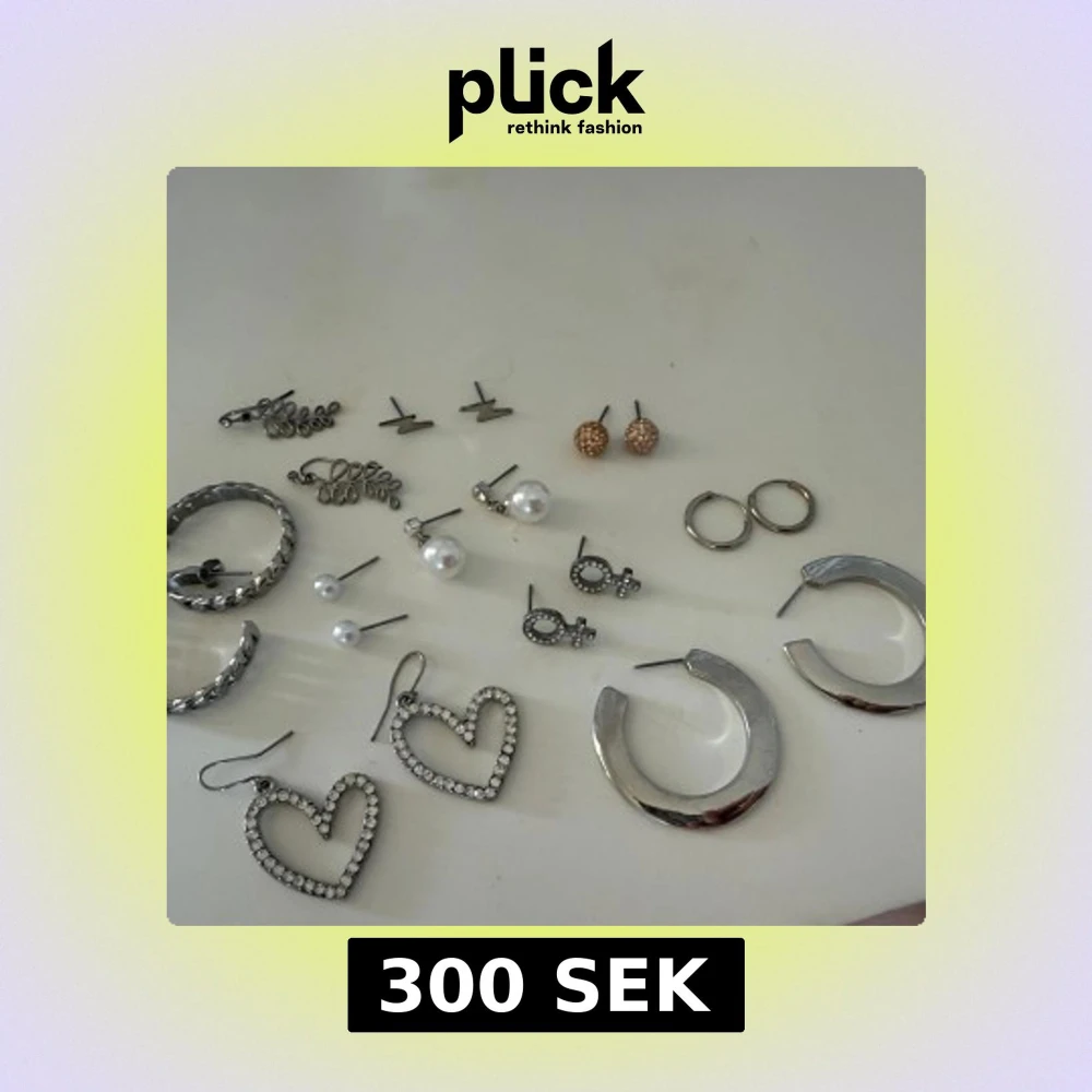 Säljer ett set med olika örhängen: stora hjärtan med glittriga stenar, pärlörhängen, hoops i silver, små guldiga studs, blixtar och örhängen med kvinnosymbol. Perfekt för dig som vill variera din stil och mixa olika former och uttryck. Säljer alla för 300kr, men är man endast intresserad av ett par eller två par tillexemepel så får man ett pris på det 😊! Kom gärna privat då ! 🥰 örhängena är blandade med bra skick och mycket bra skick så vill man veta mer exakt så kom privat !💓